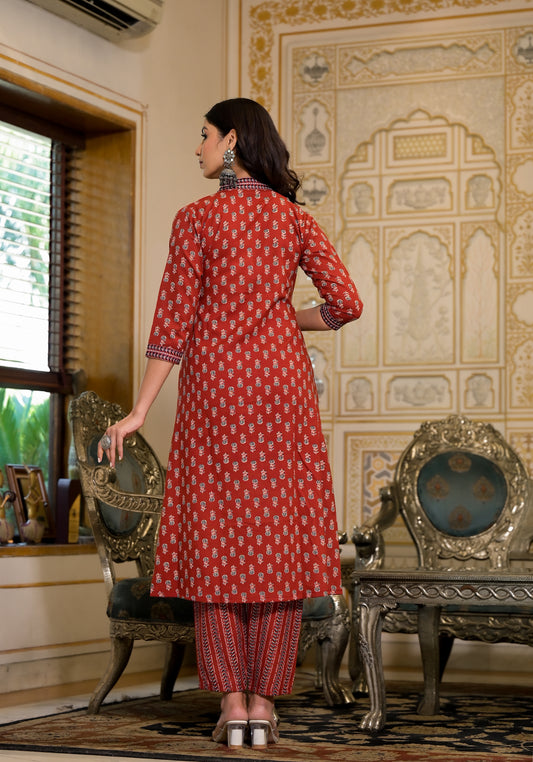 Ethnic Set Women Floral Anarkali Printed Red Kurta and Pant Set With Dupatta