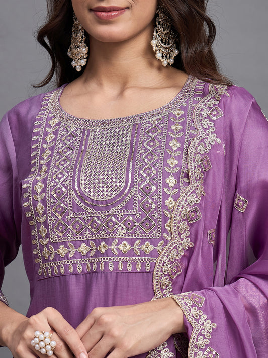 Ethnic Set Women Printed Anarkali Purple Kurta and Pant Set With Dupatta
