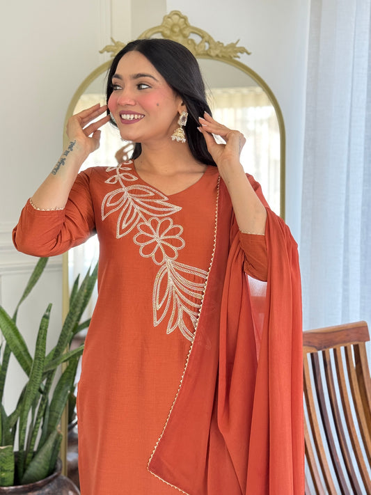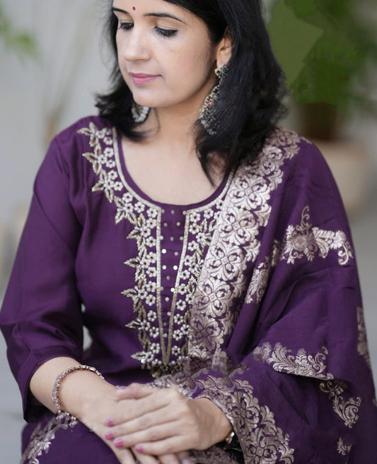 Women's Solid Embroidery Kurta Set – Ethnic Festive Wear (Kurta + Pants + Dupatta)