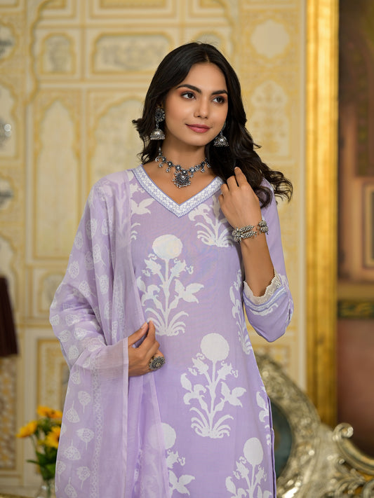 Ethnic Set Women Block Printed Straight Kurta and Pant set with Dupatta