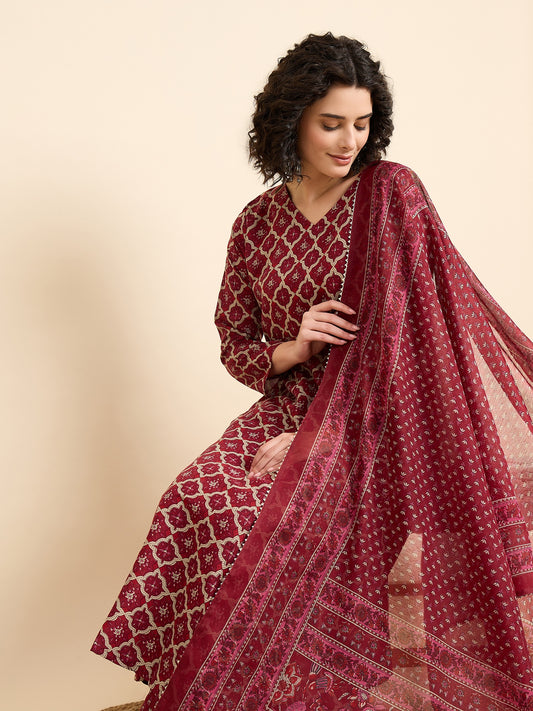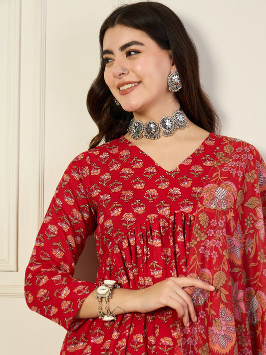 Ethnic Set Women Printed Anarkali Red Kurta and Pant Set With Dupatta