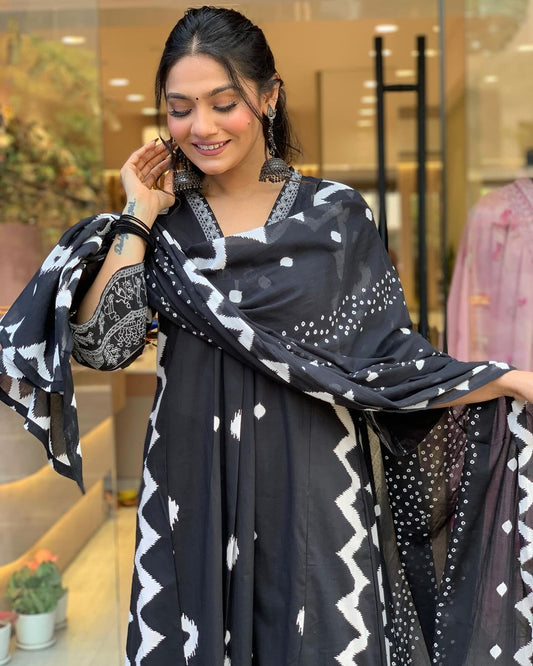 Ethnic Set Women Printed A-Line Black Kurta and Pant Set With Dupatta