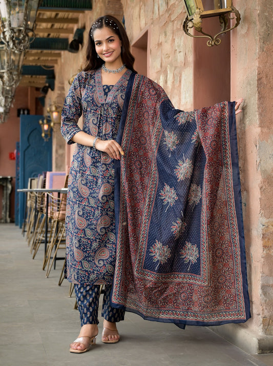 Ethnic Set Women Printed A-Line Blue Kurta And Pant Set With Dupatta