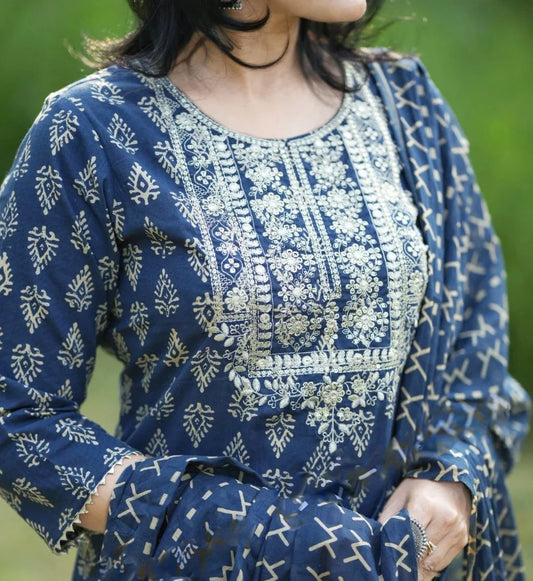 Ethnic Set Women Printed Straight Blue Kurta and Pant set with Dupatta