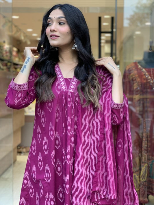 Ethnic Set Women Printed A-Line Purple Kurta and Pant Set With Dupatta
