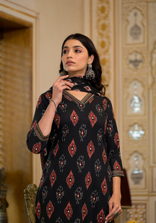 Ethnic Set Women Printed Straight Black Kurta and Pant Set With Dupatta