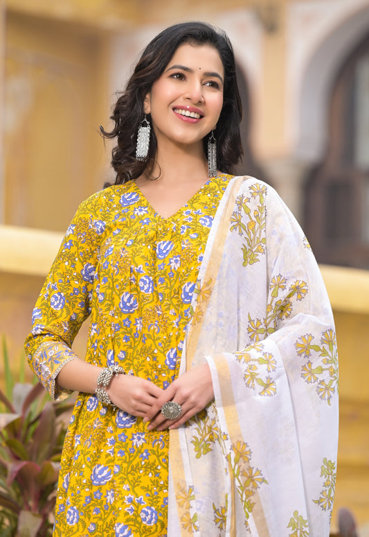 Ethnic Set Women Floral Printed Flared A-Line Kurta and Pant set with Dupatta
