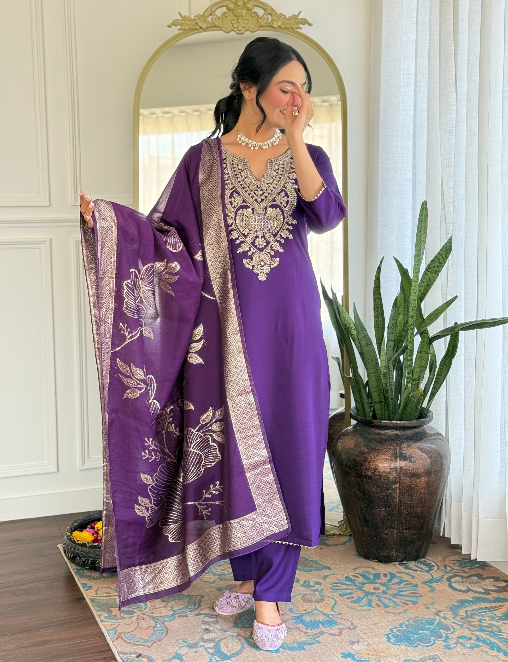 Women's Solid Embroidery Kurta Set – Ethnic Festive Wear (Kurta + Pants + Dupatta)