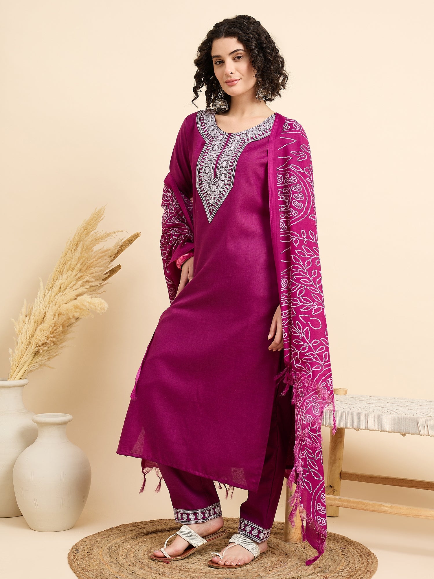 Ethnic Set Women Silk Embroidery Straight Kurta and Pant Set with dupatta