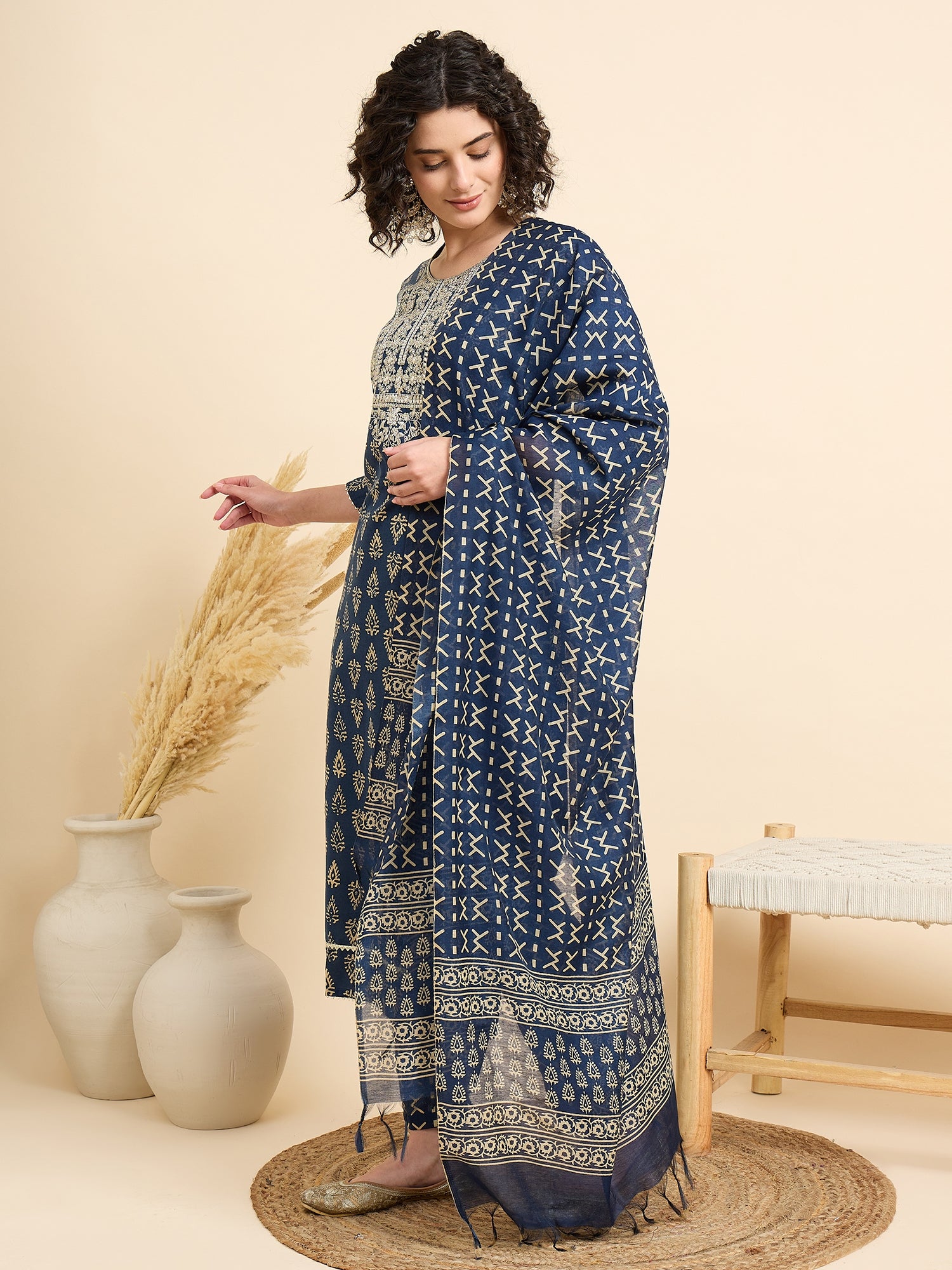 Ethnic Set Women Embroidered Straight Blue Kurta And Pant Set With Dupatta