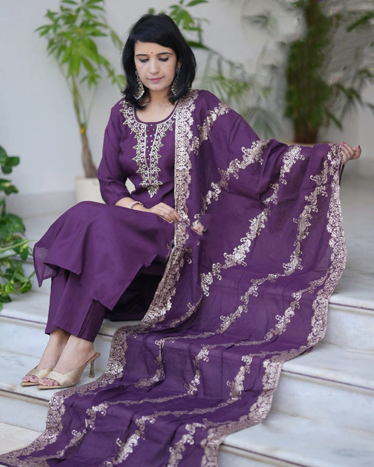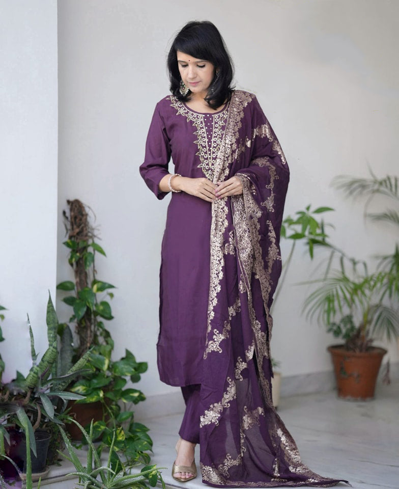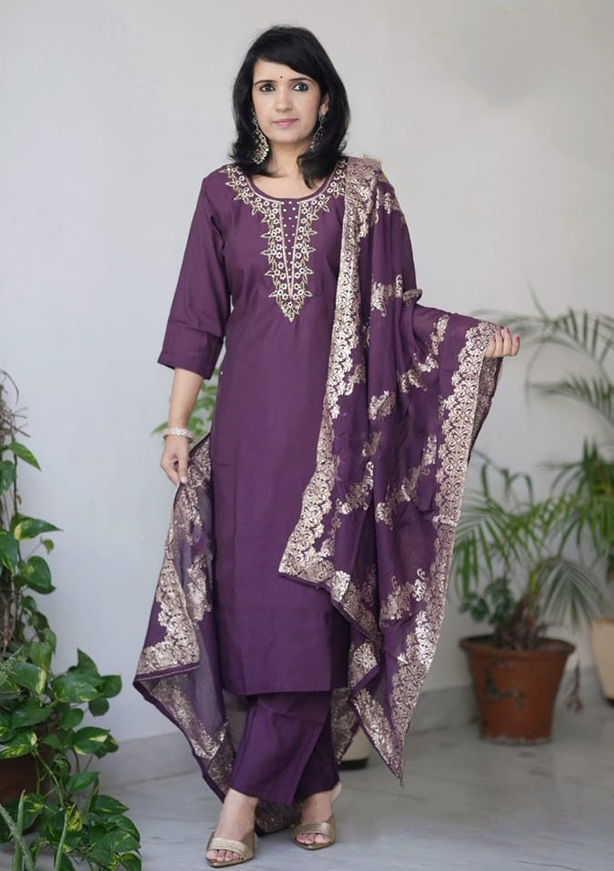 Women's Solid Embroidery Kurta Set – Ethnic Festive Wear (Kurta + Pants + Dupatta)