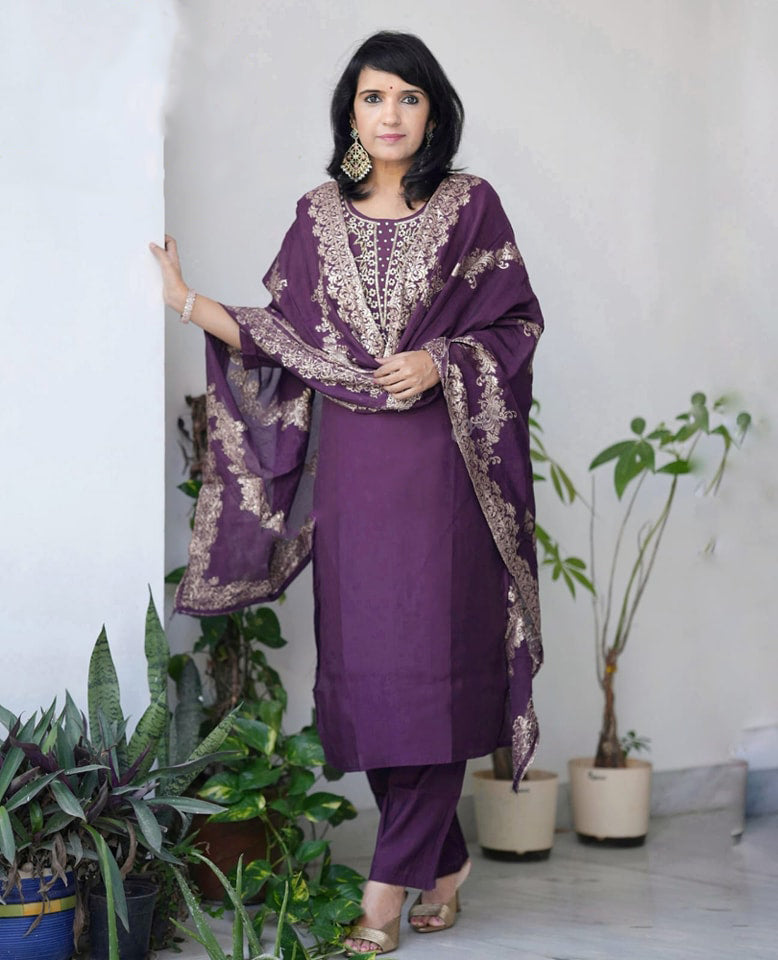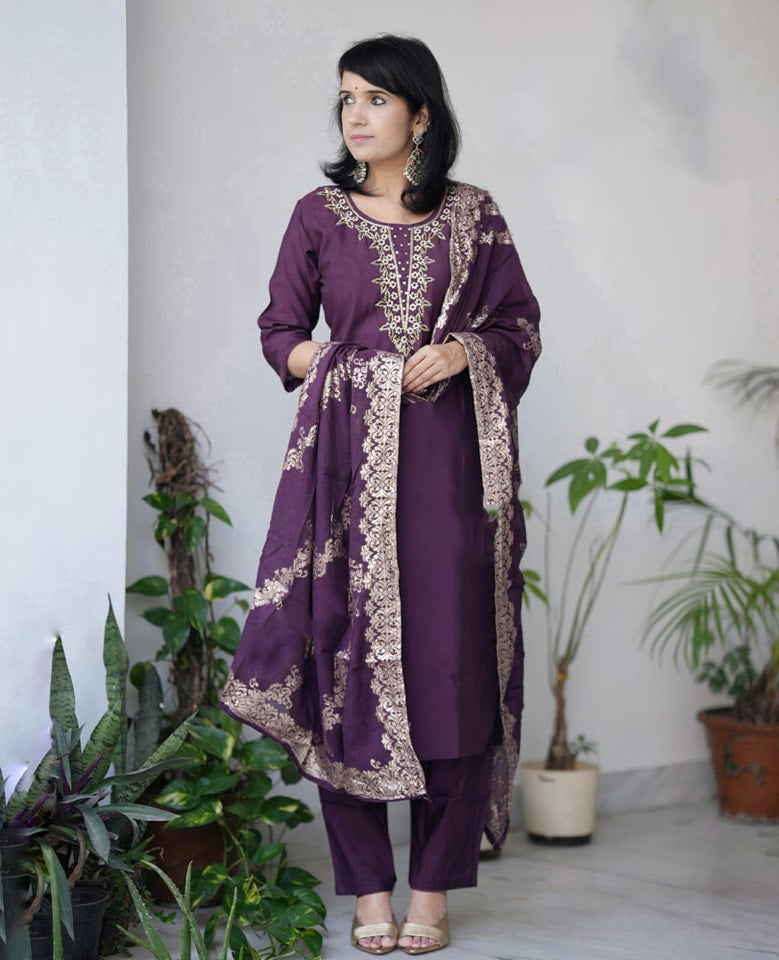 Ethnic Set Women Silk Embroidery Straight Kurta and Pant Set with dupatta