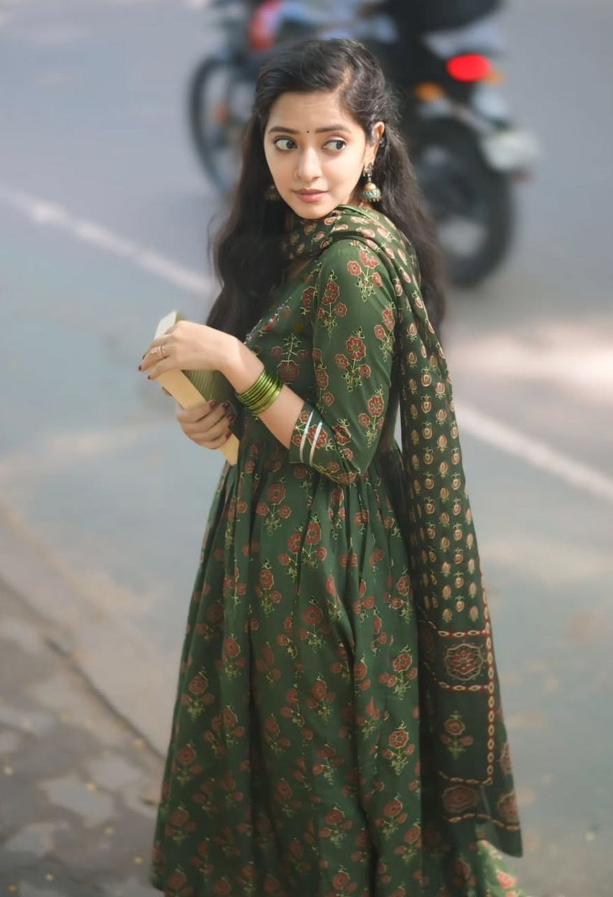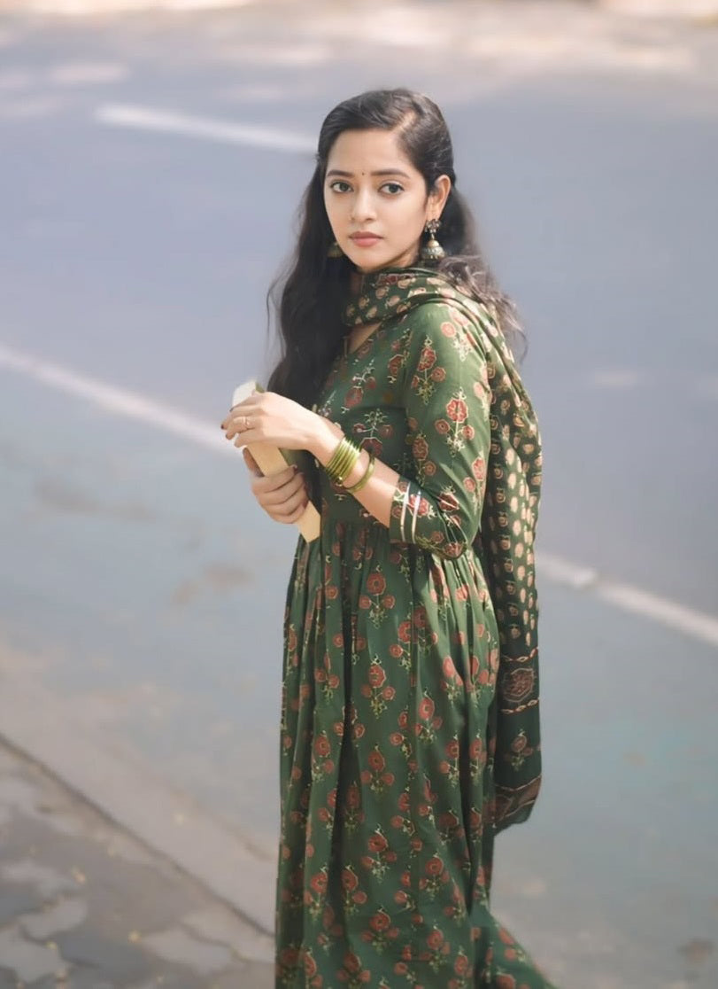 Ethnic Set Women Floral Anarkali Printed Green Kurta and Pant Set With Dupatta
