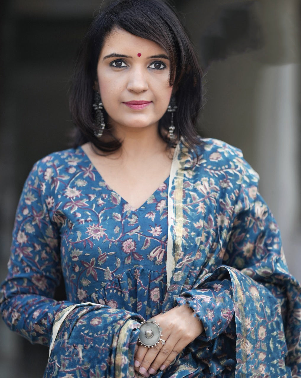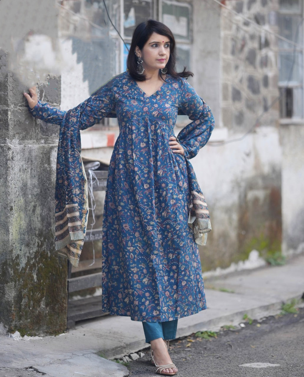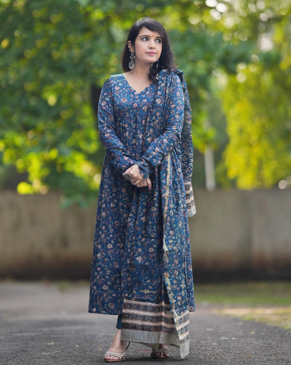Ethnic Set Women Floral Printed Anarkali Blue Kurta And Pant Set With Dupatta