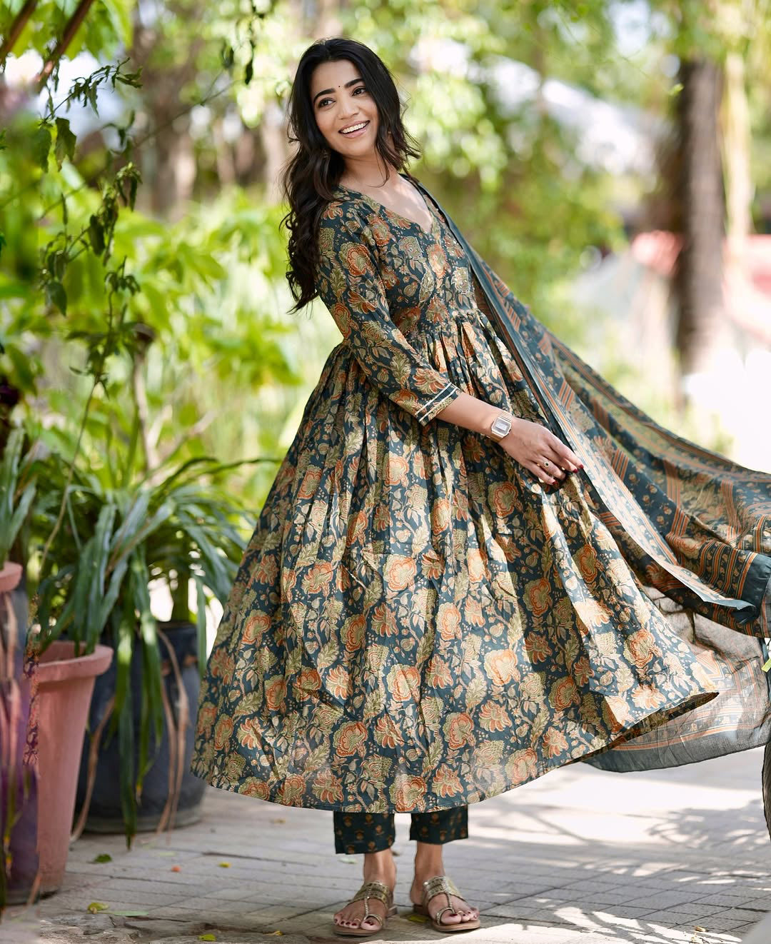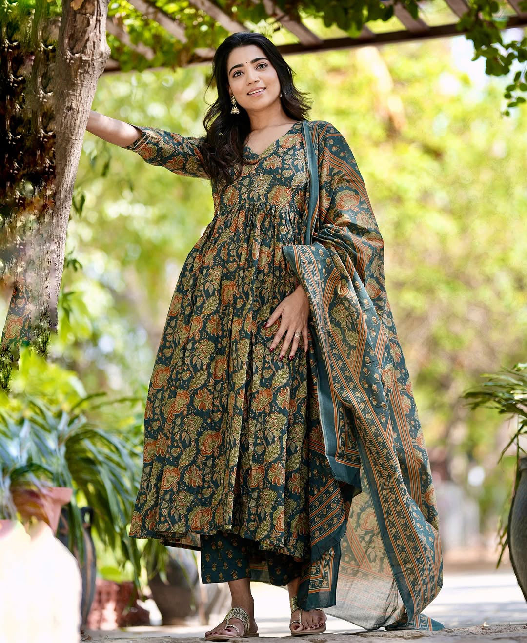 Ethnic Set women Printed Flared Anarkali Kurta and Pant Set with Dupatta