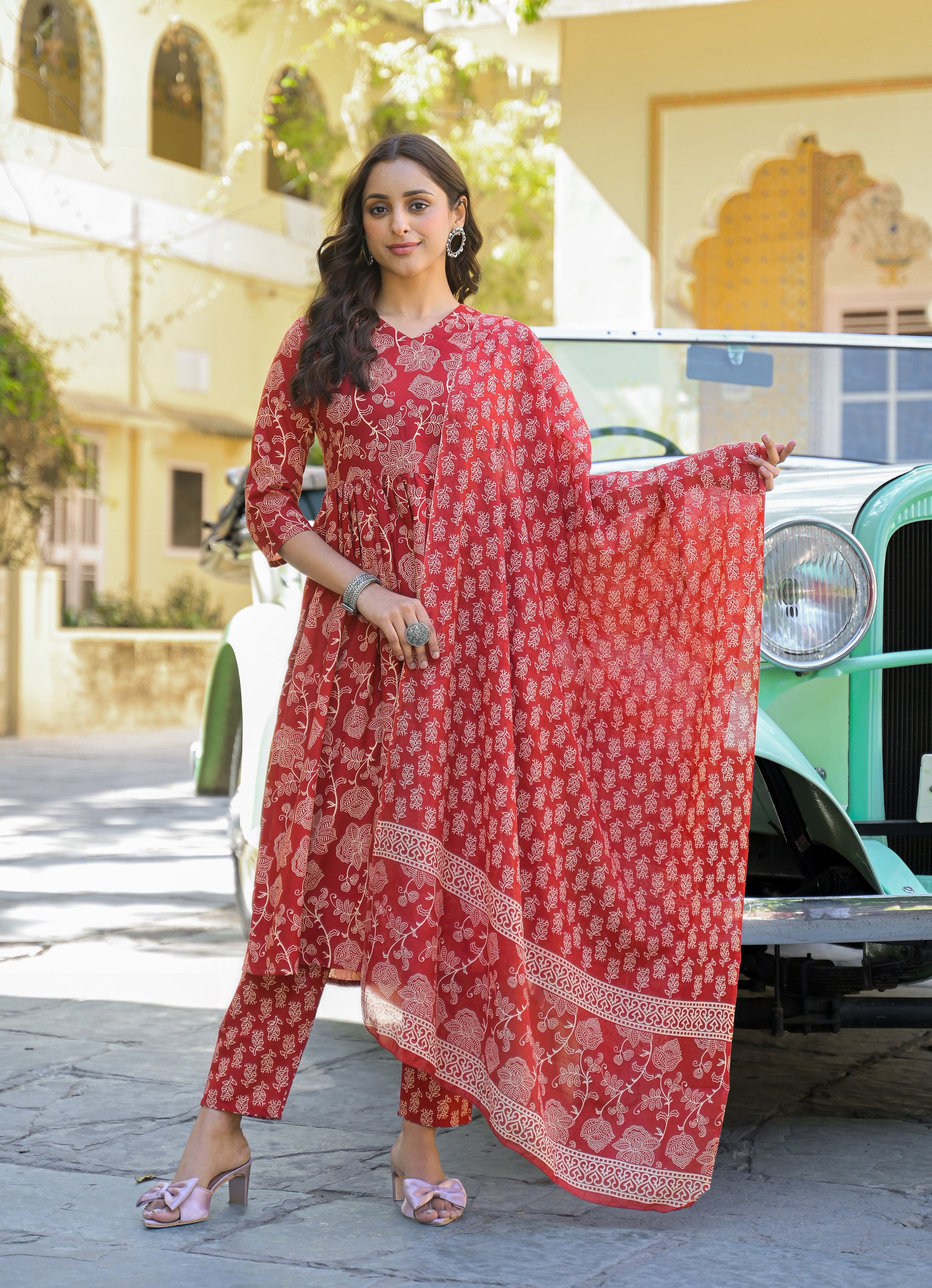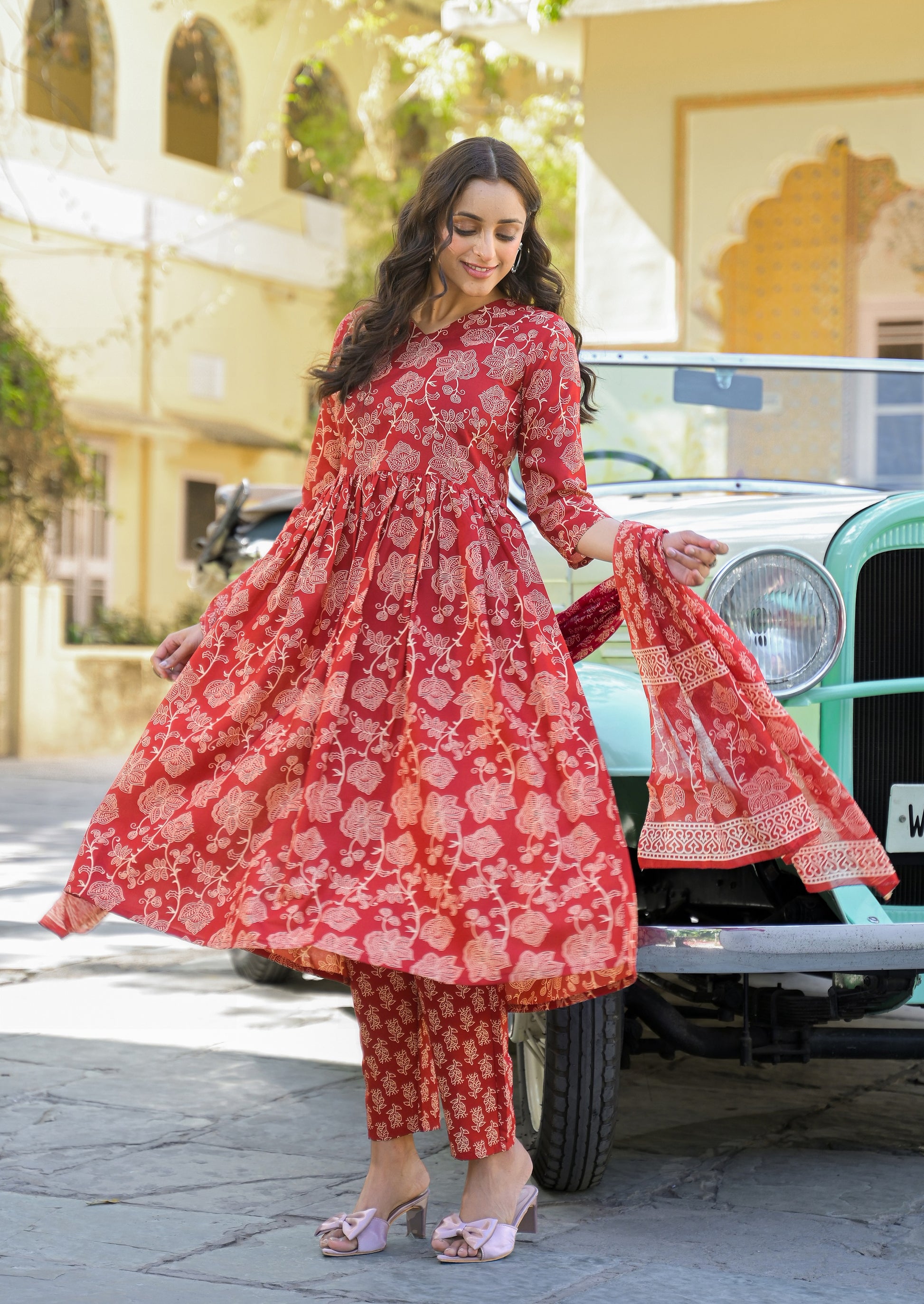 Ethnic Set Women Floral Printed Anarkali Red Kurta And Pant Set With Dupatta
