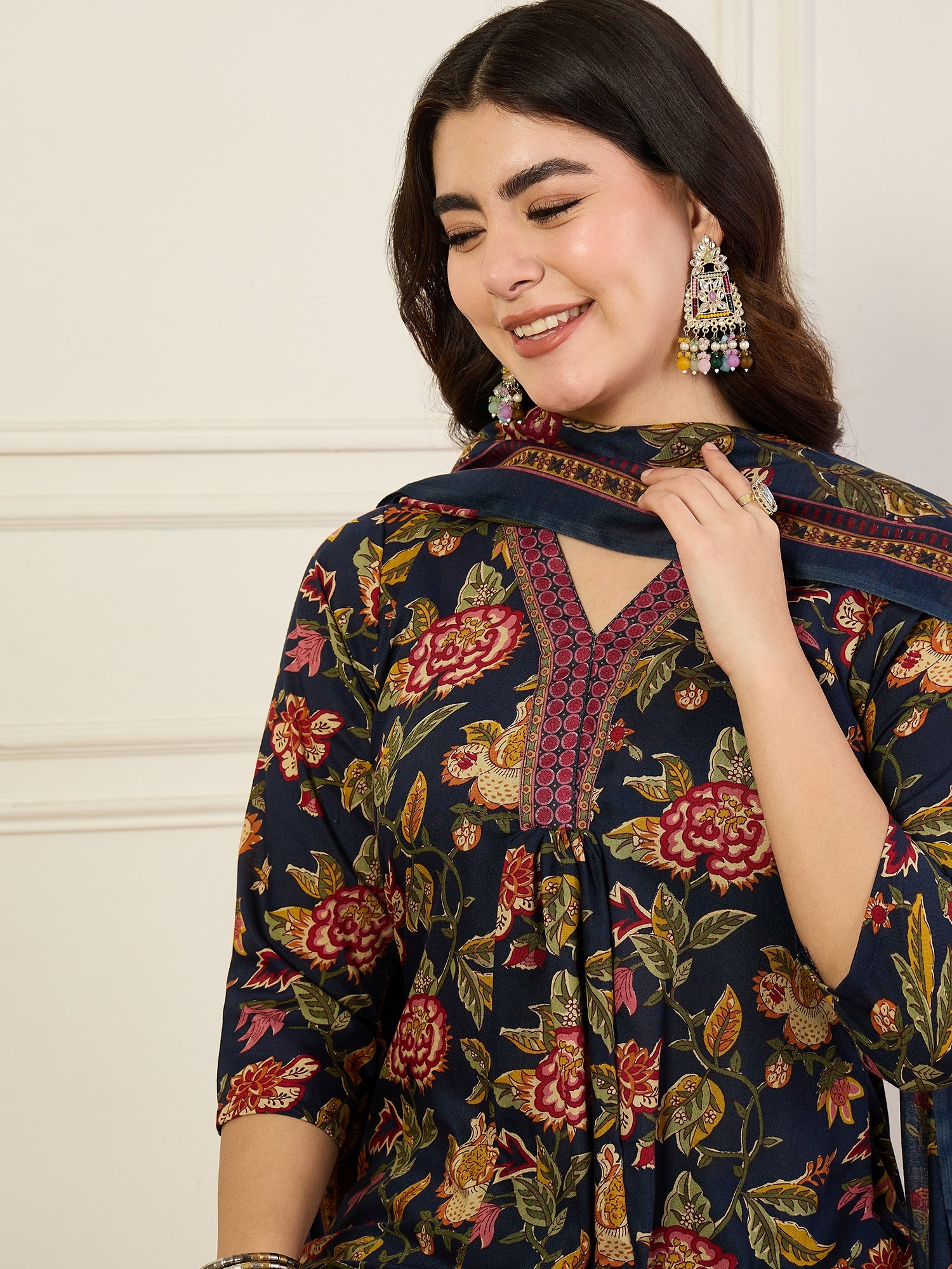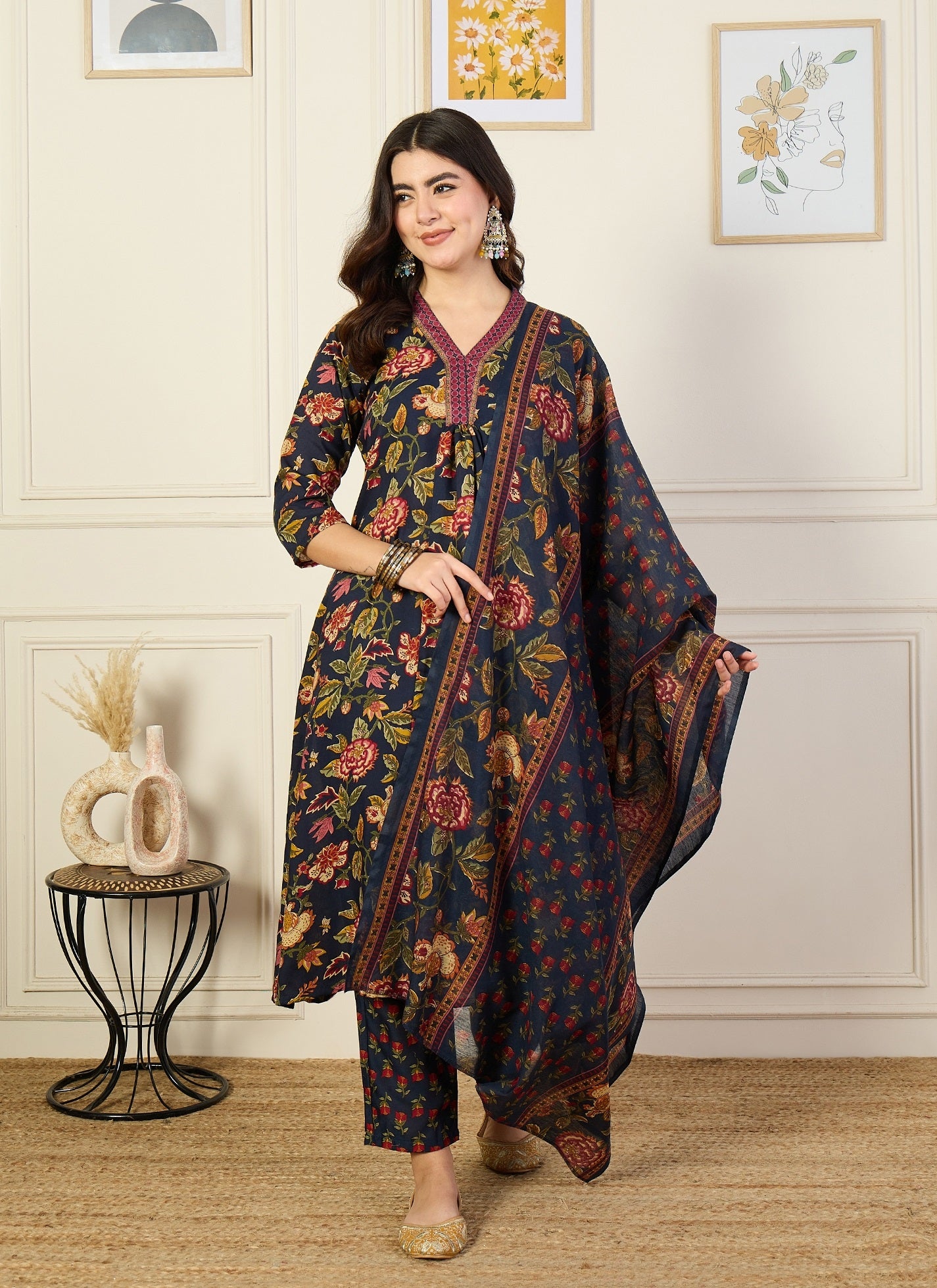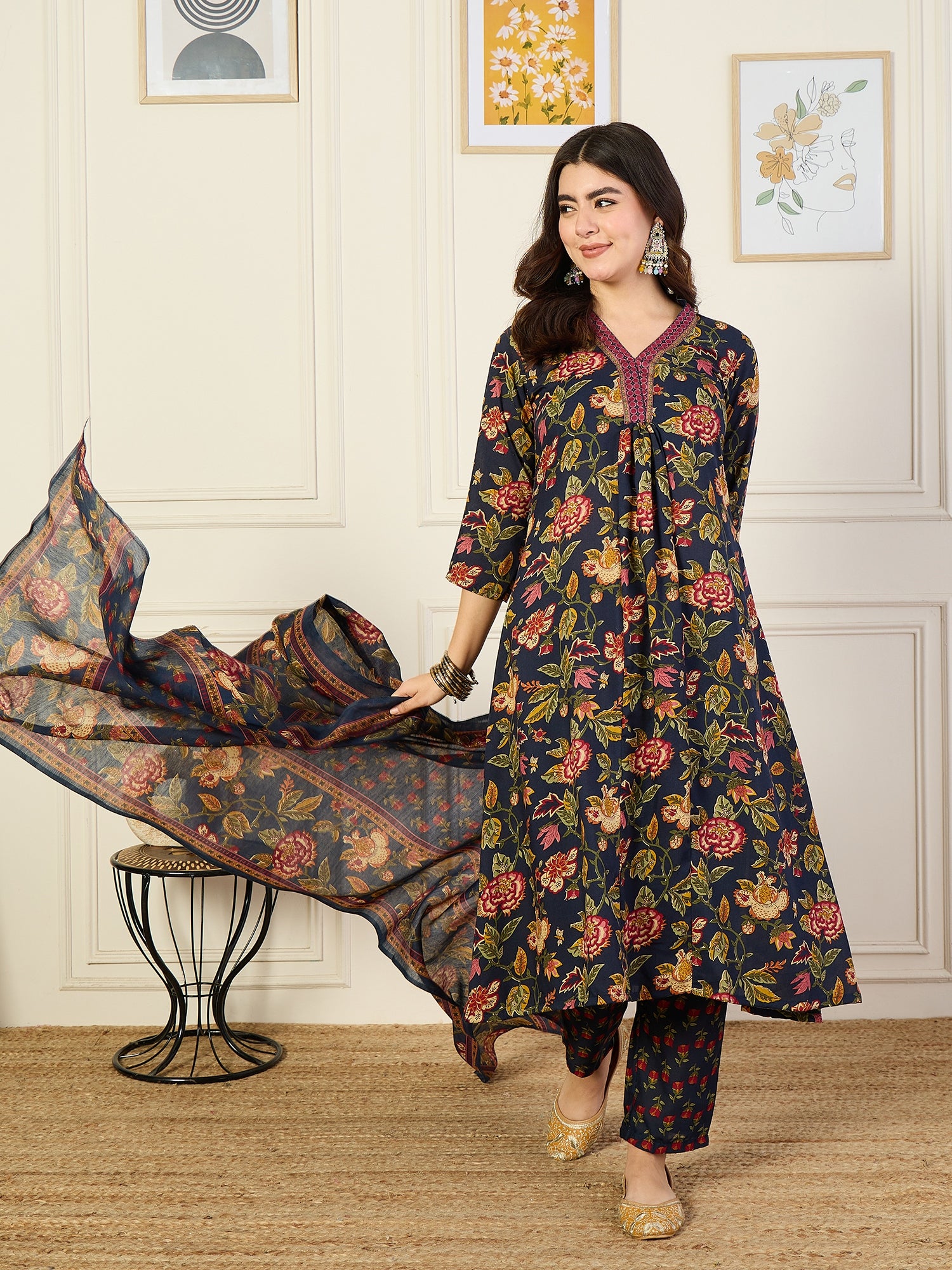 Ethnic Set Women Floral Printed Flared A-Line Kurta and Pant set with Dupatta