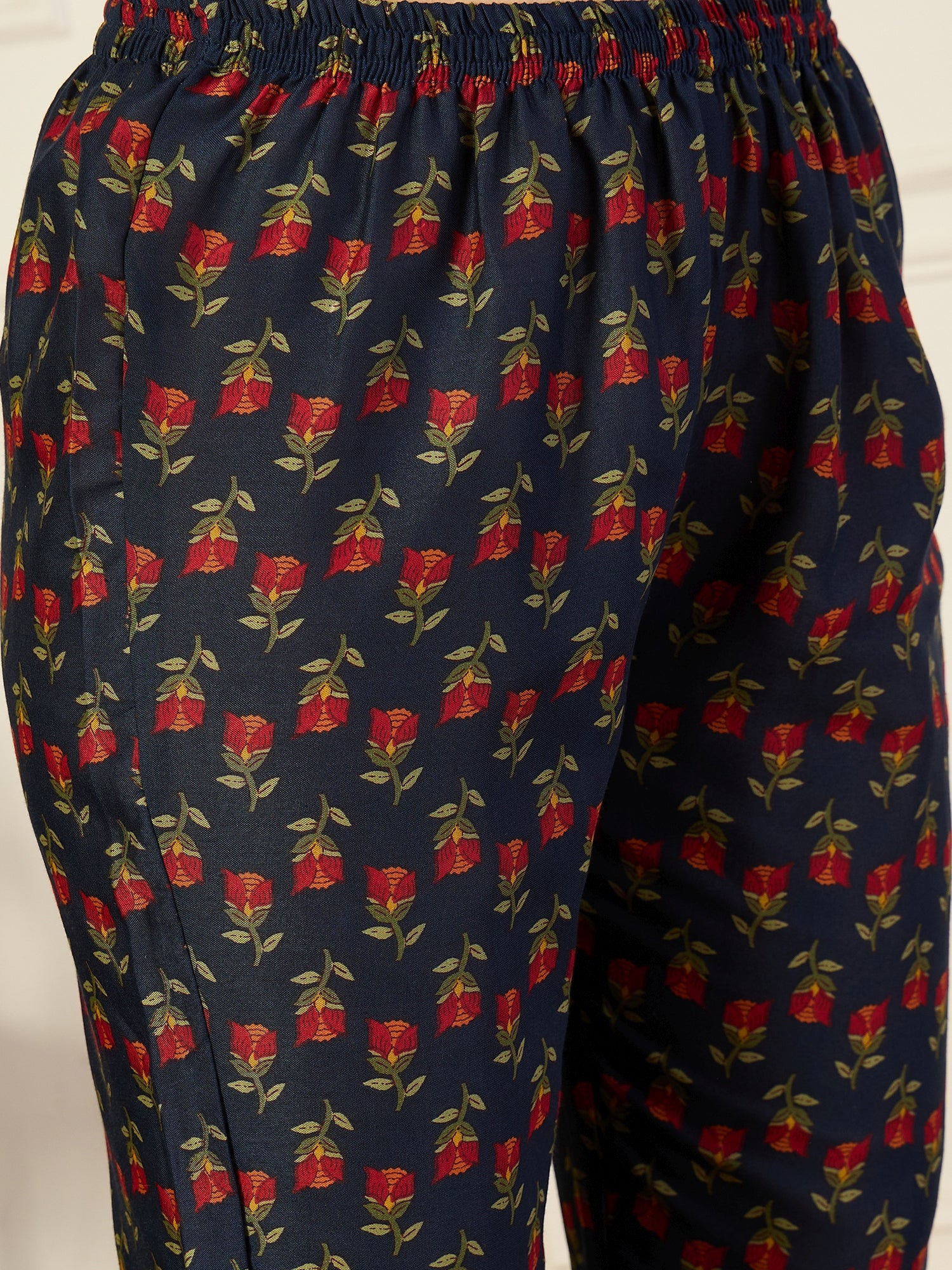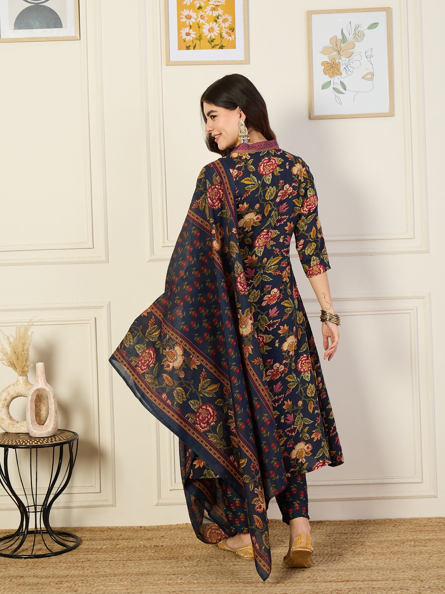 Ethnic Set Women Printed A-Line Floral Blue Kurta and Pant Set With Dupatta