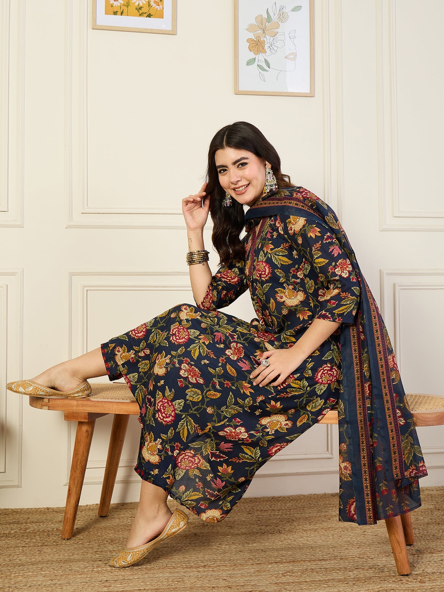 Ethnic Set Women Floral PrintedStraight Kurta and Pant set with Dupatta