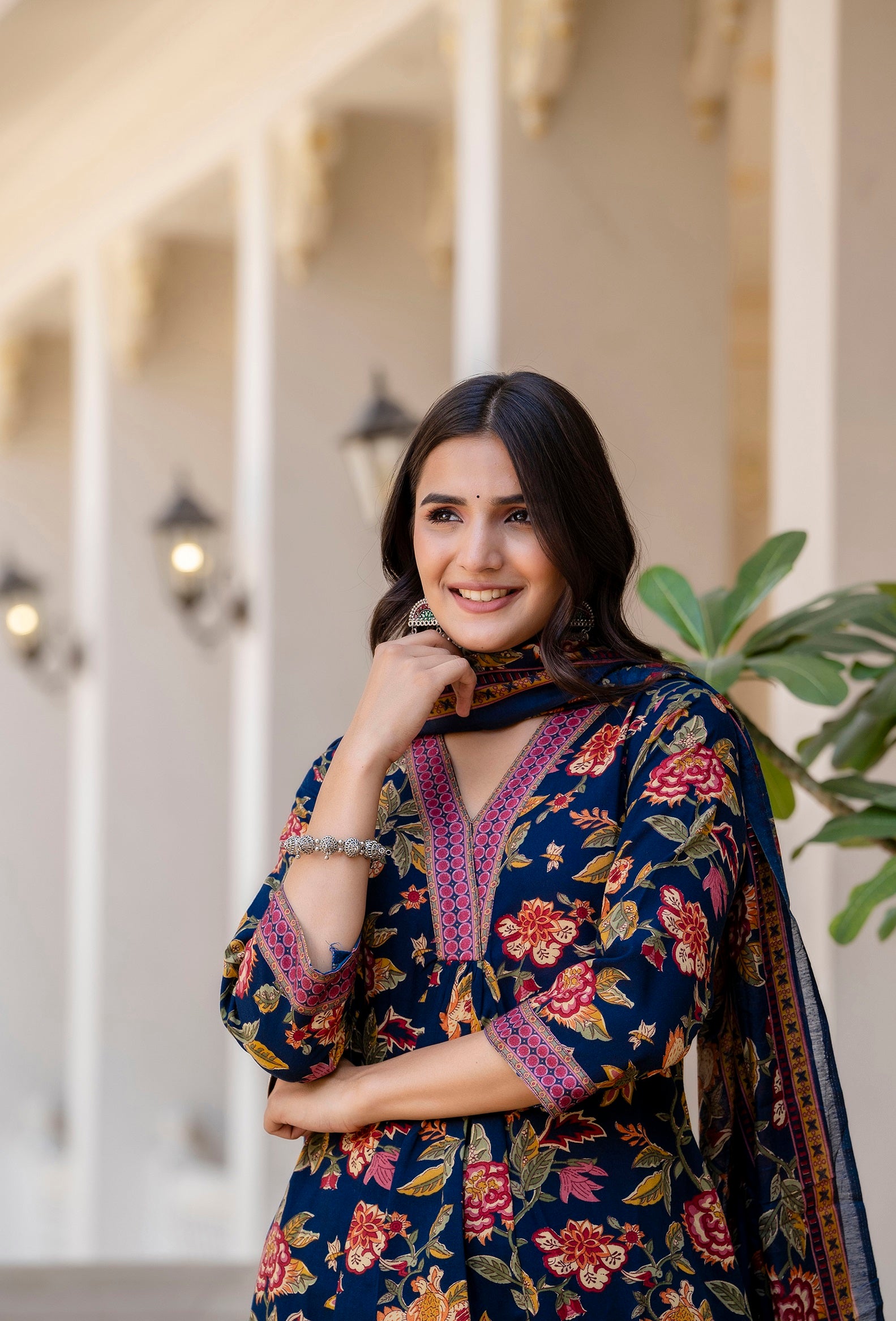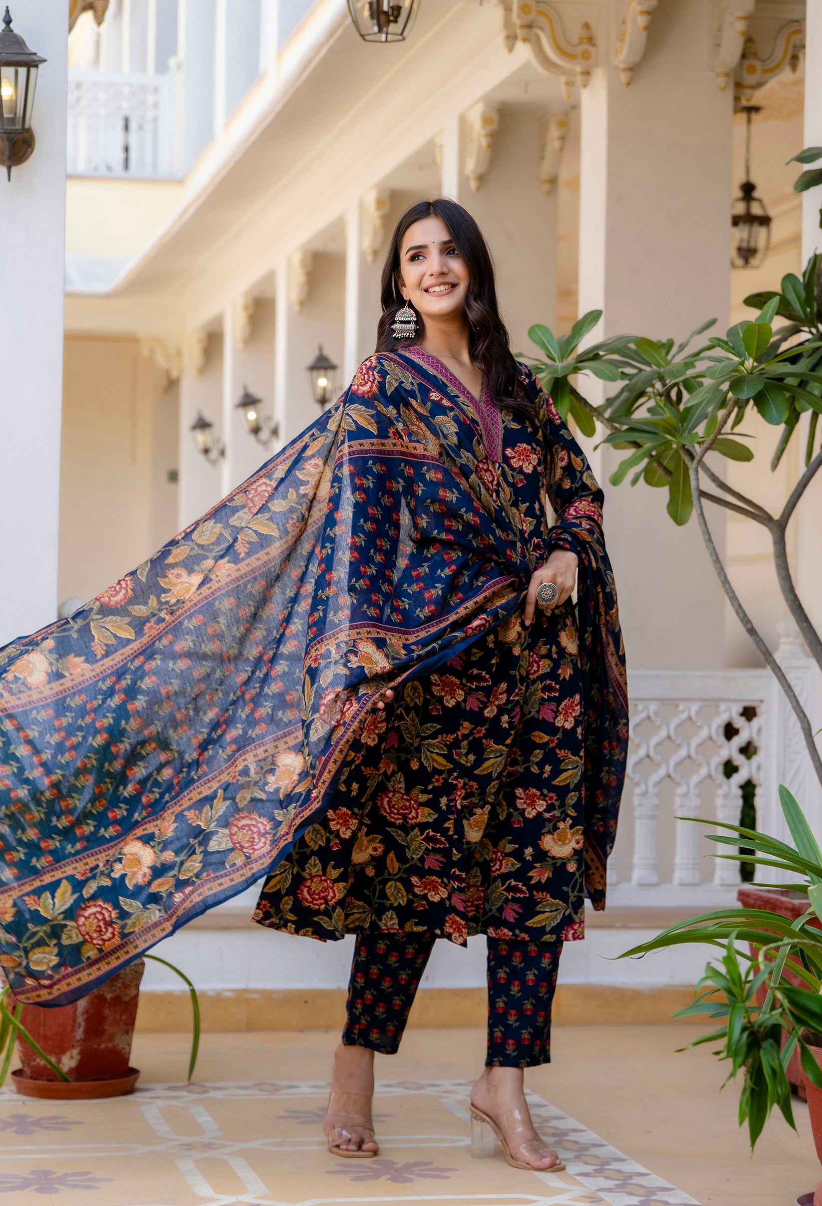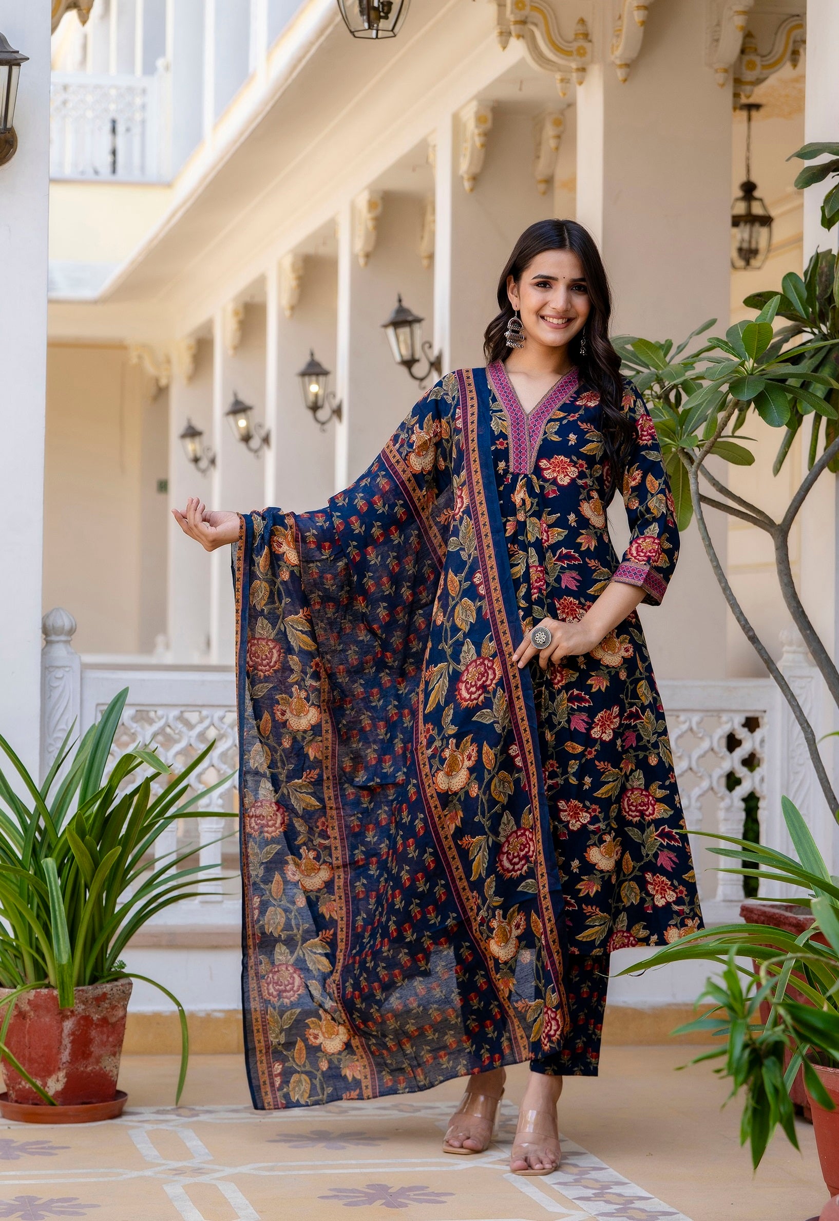 Ethnic Set Women Floral Printed Flared A-Line Kurta and Pant set with Dupatta