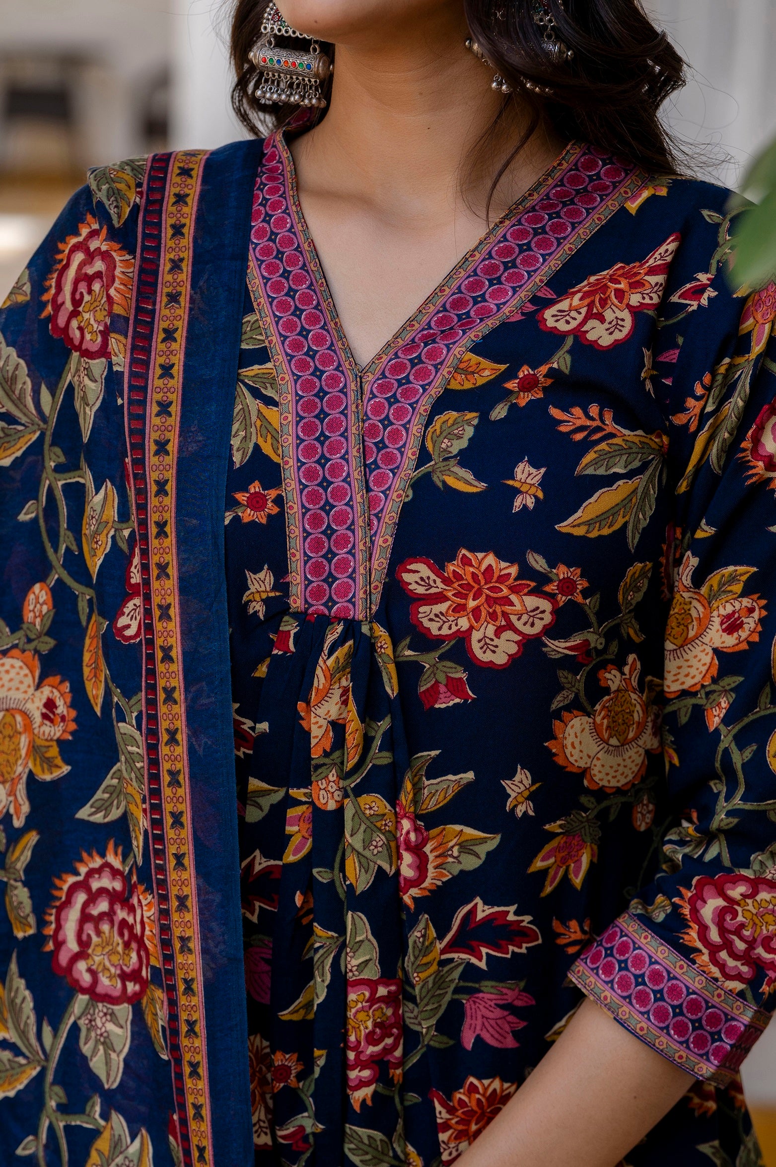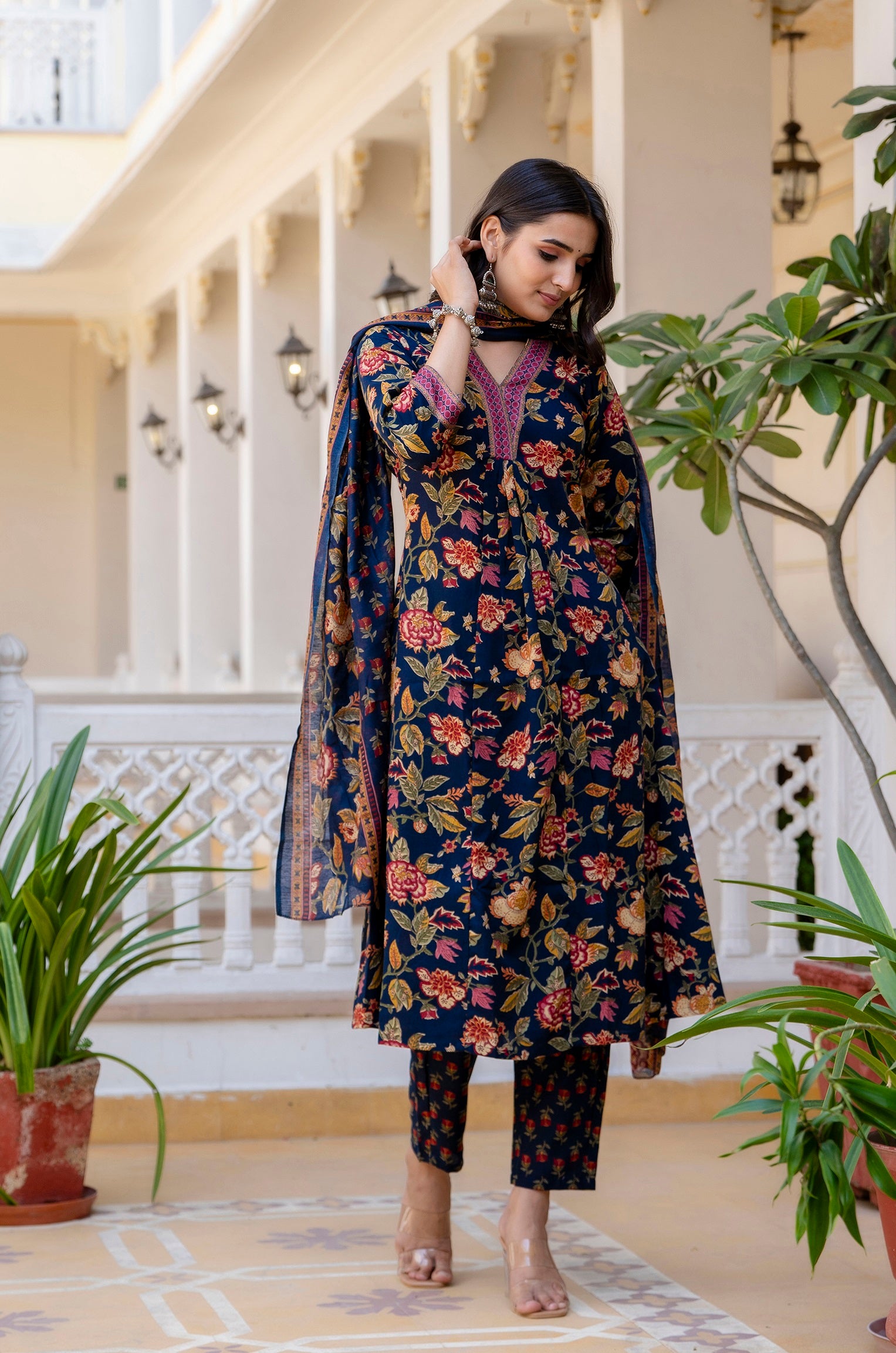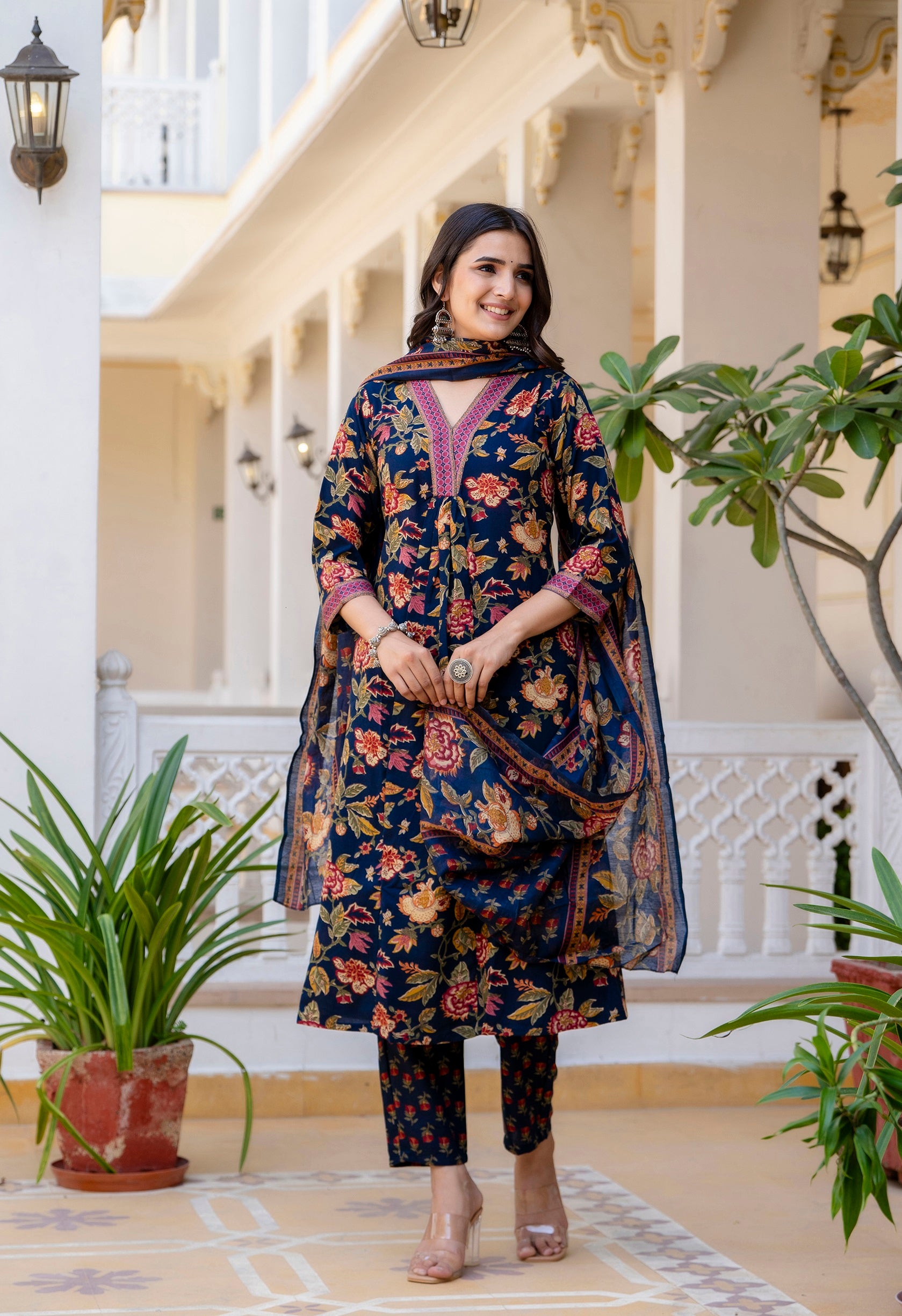 Ethnic Set Women Floral Printed Flared A-Line Kurta and Pant set with Dupatta