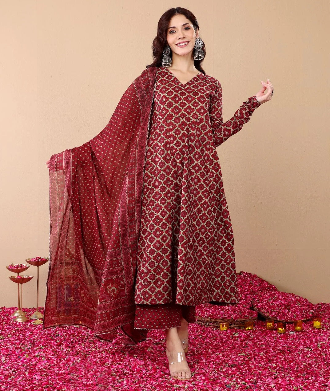 Ethnic Set women Printed Flared Anarkali Kurta and Pant Set with Dupatta