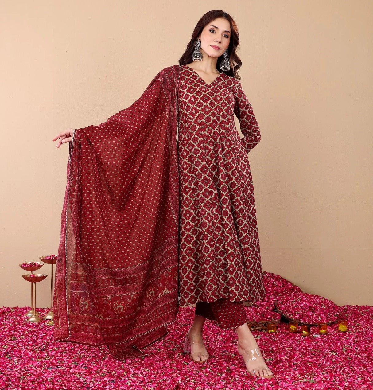 Ethnic Set Women Printed Anarkali Kurta and Pant set with Dupatta