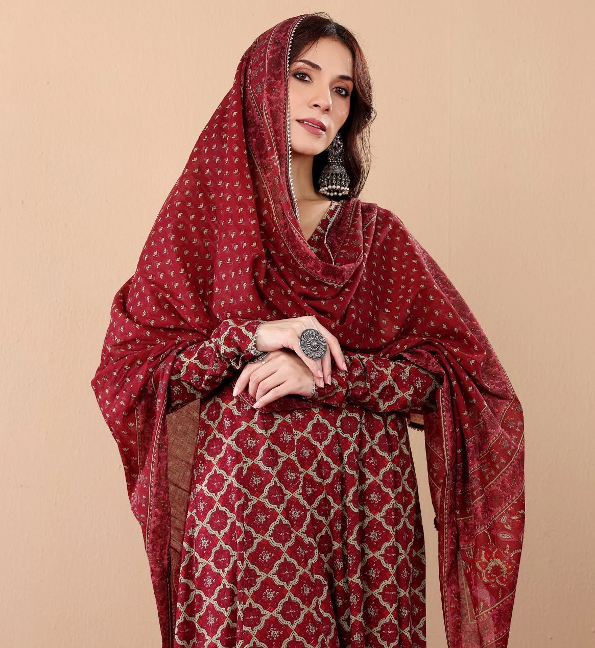 Ethnic Set Women Ajarakh Printed Kurta and Pant Set With Dupatta
