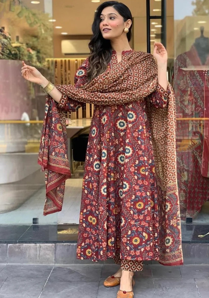 Ethnic Set Women Printed Anarkali Kurta and Pant Set with Dupatta Set