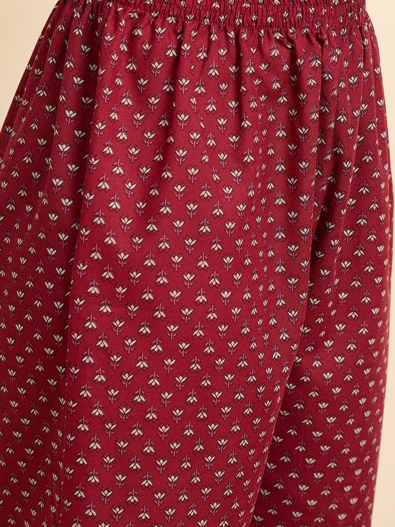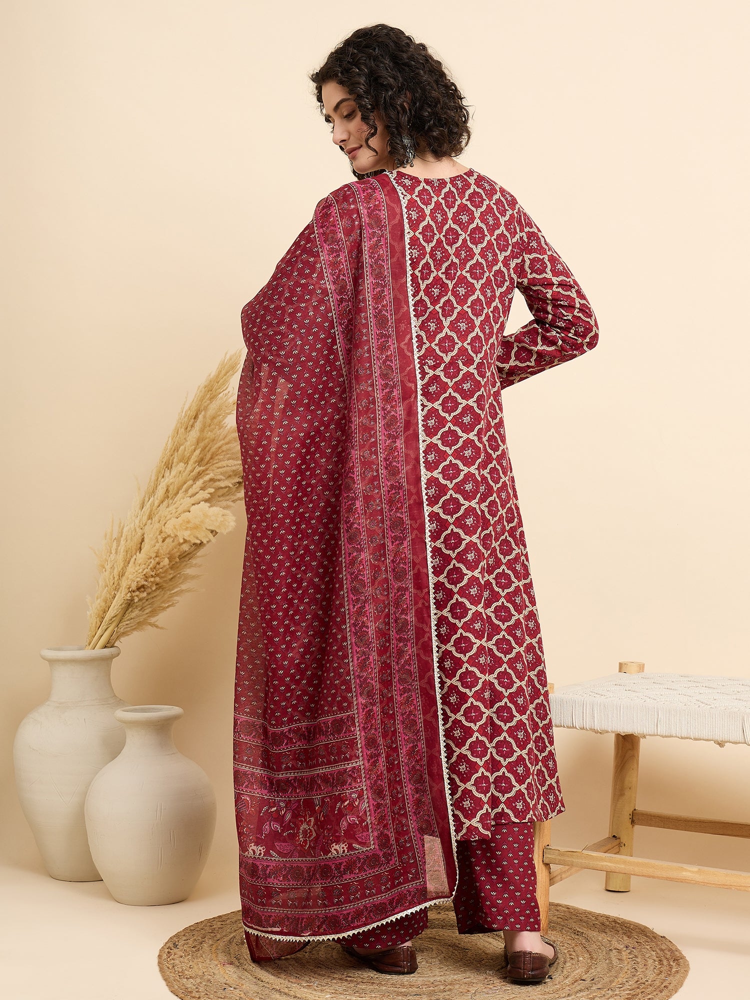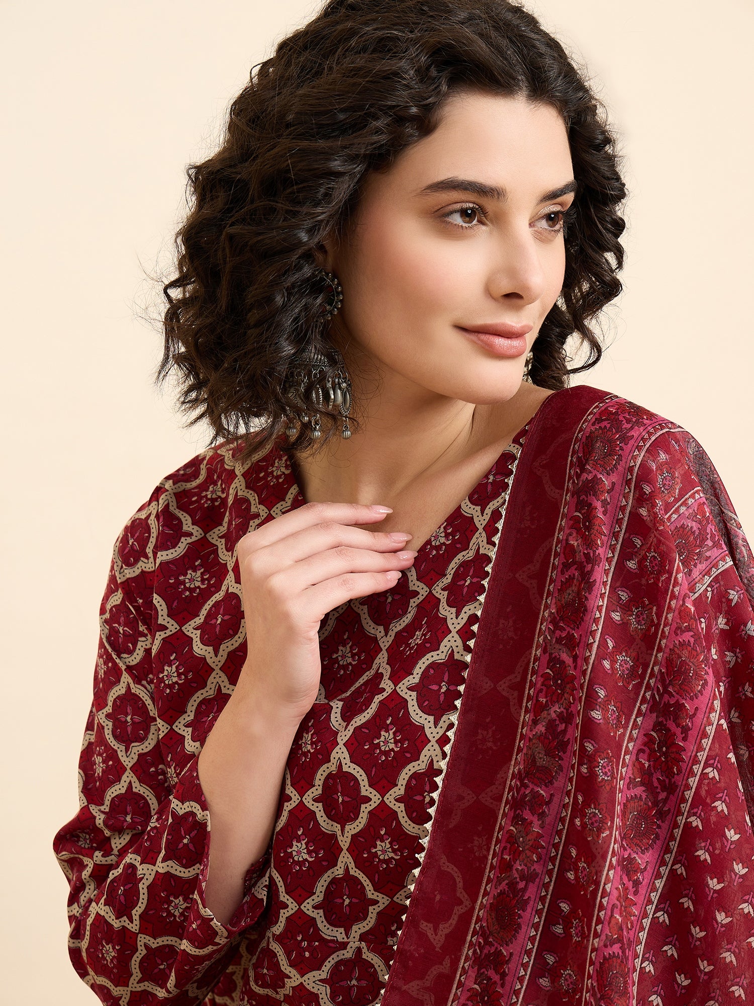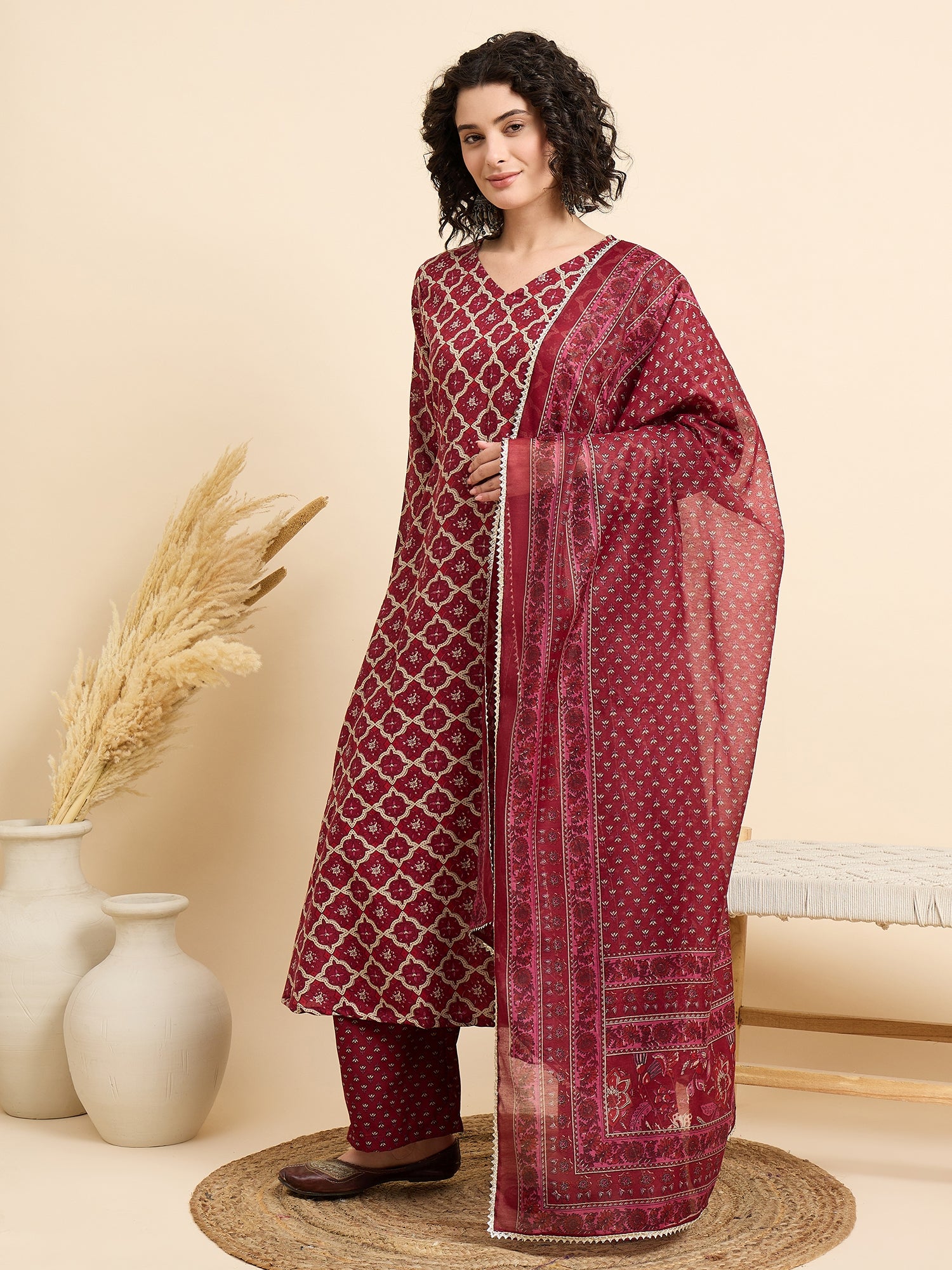 Ethnic Set Women Ajarakh Printed Kurta and Pant Set With Dupatta