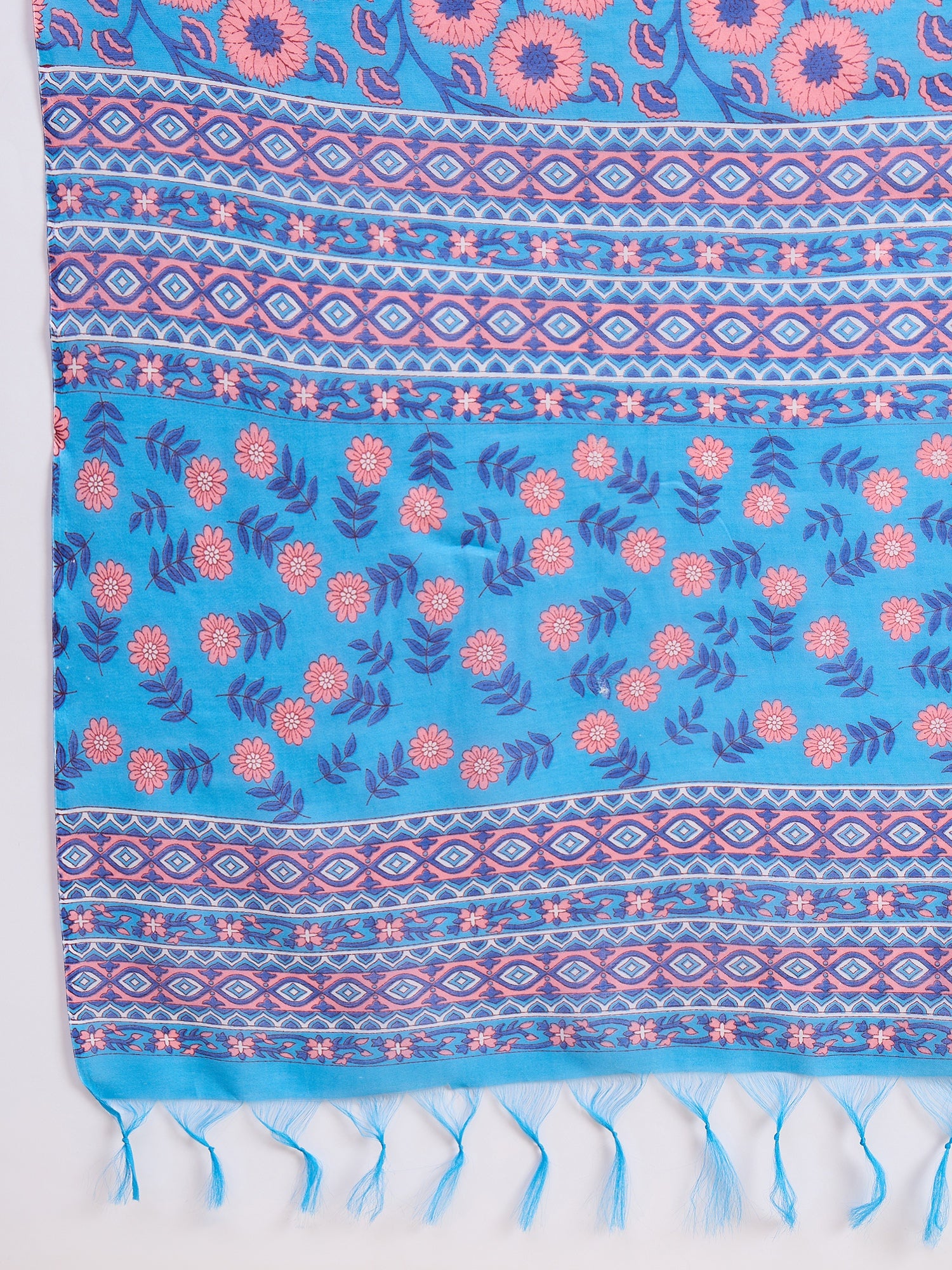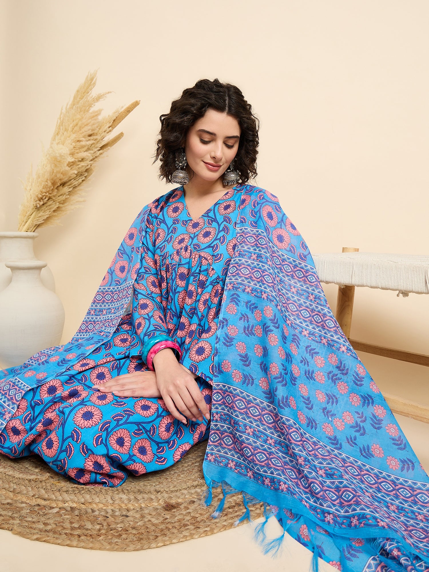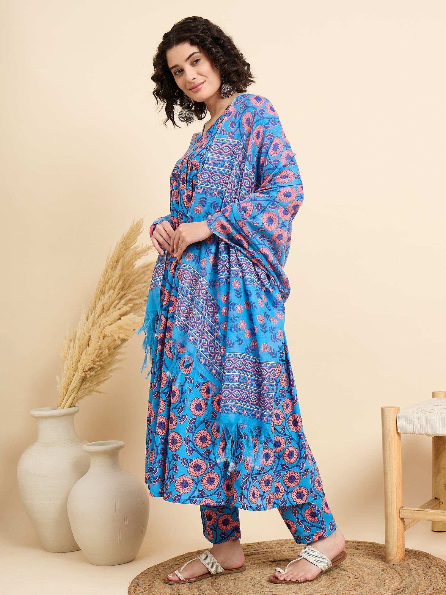 Ethnic Set Women Printed Anarkali Blue Kurta And Pant Set With Dupatta