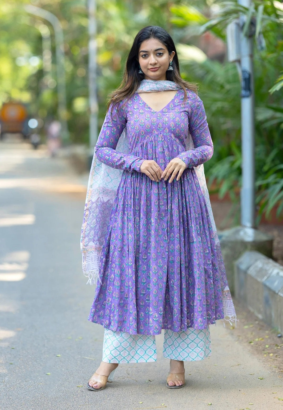 Ethnic Set women Printed Flared Anarkali Kurta and Pant Set with Dupatta
