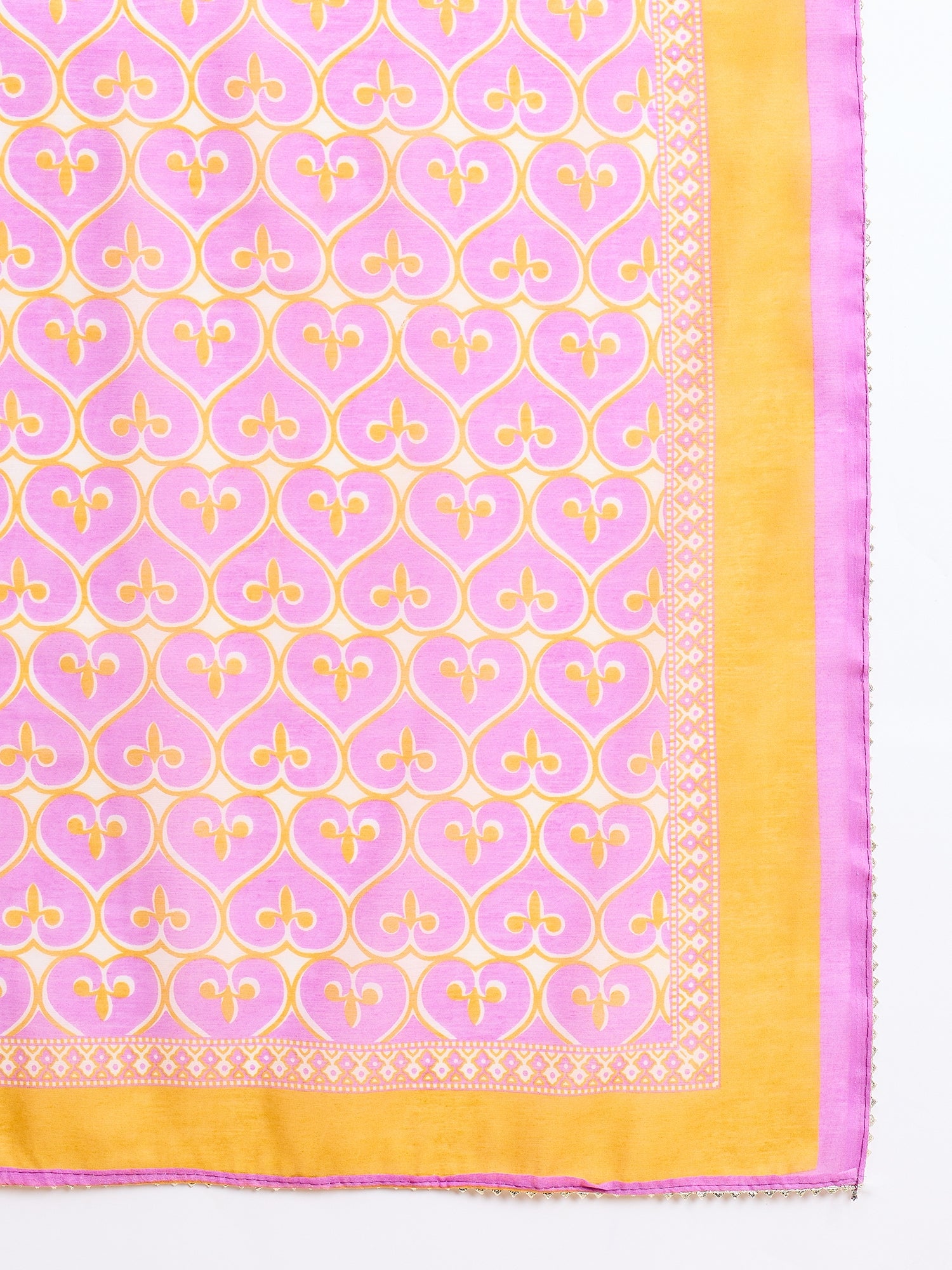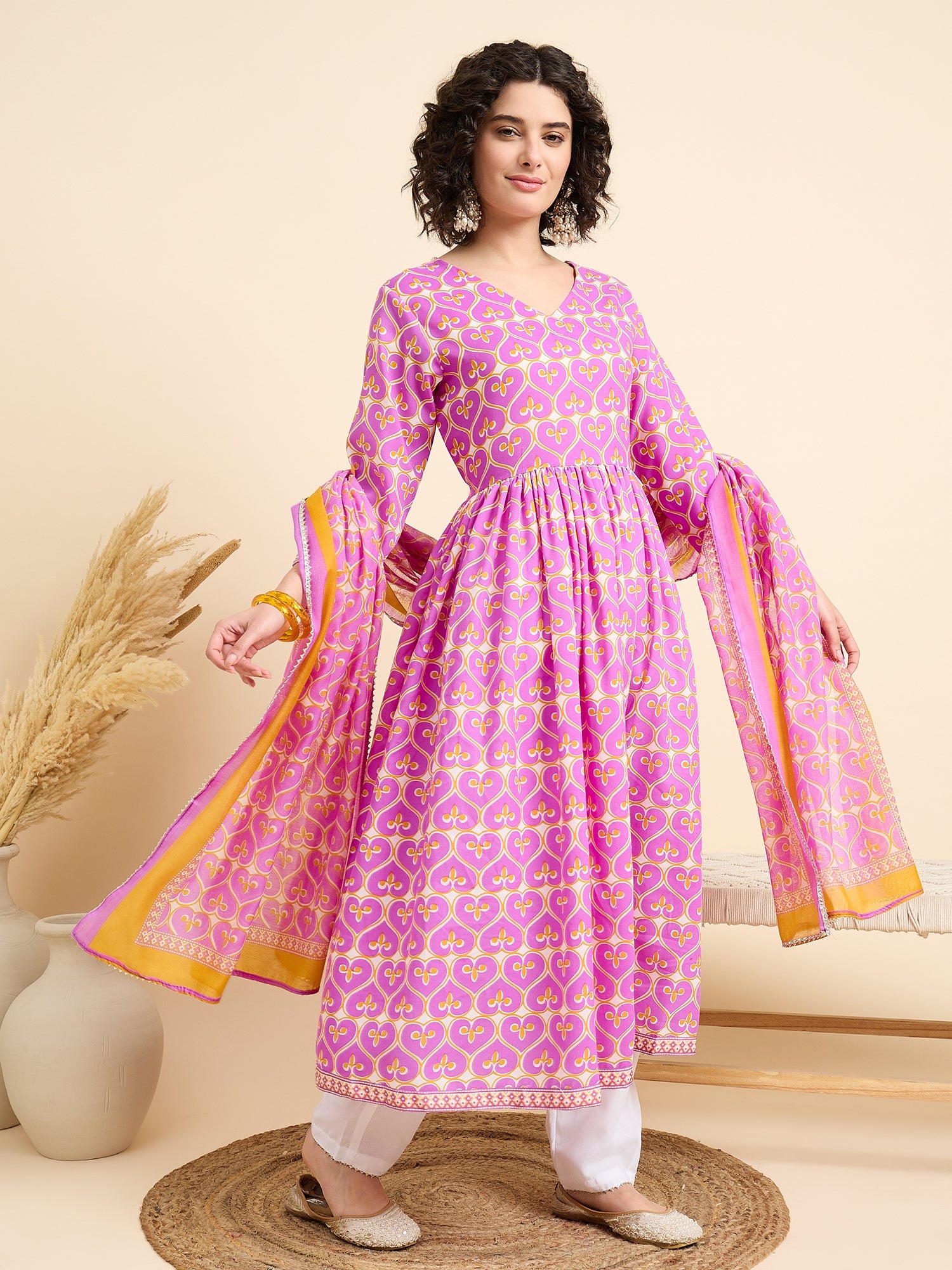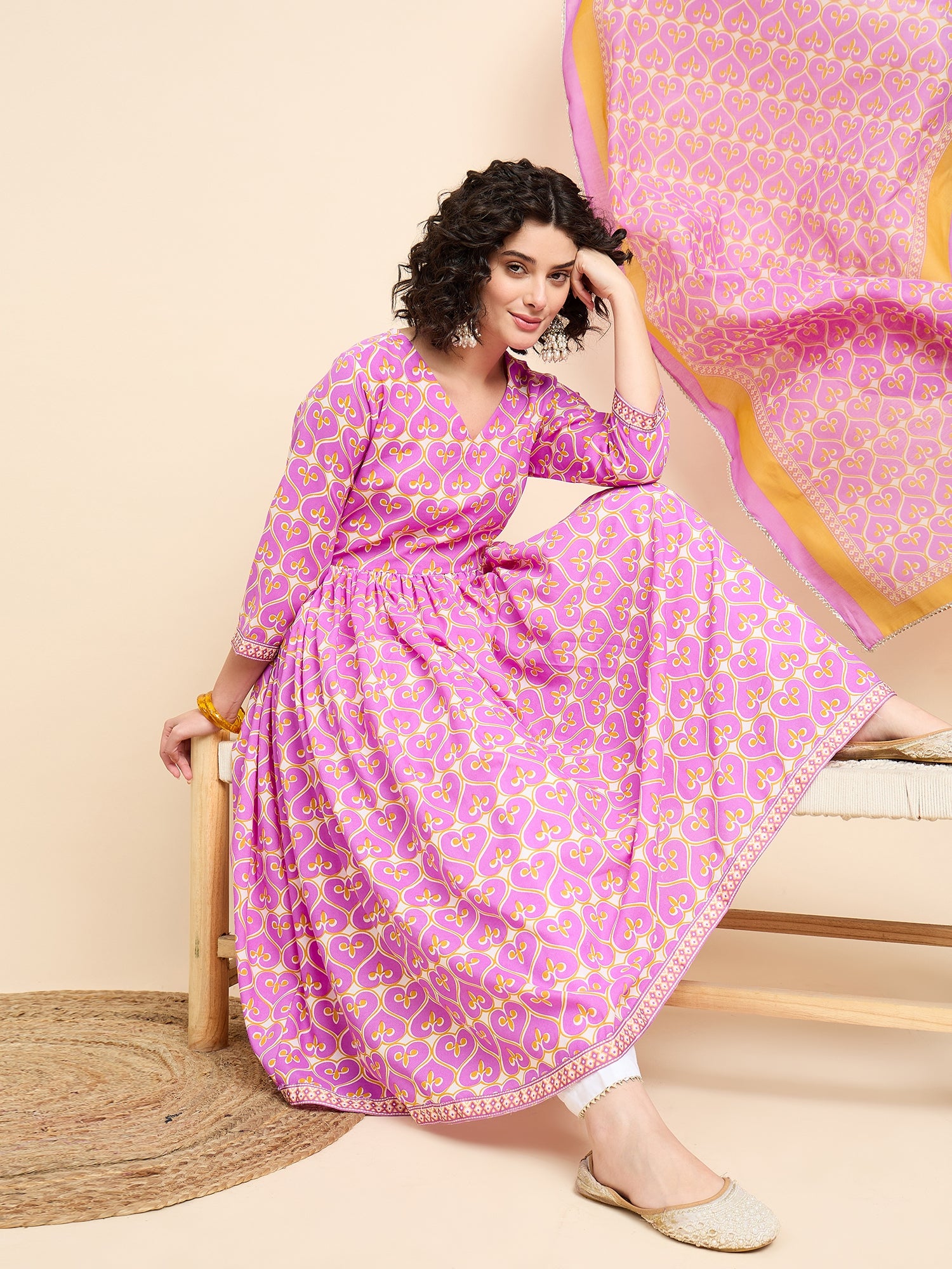 Ethnic Set Women Printed Anarkali Pink Kurta And Pant Set With Dupatta