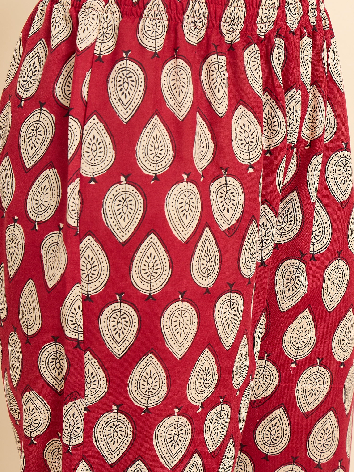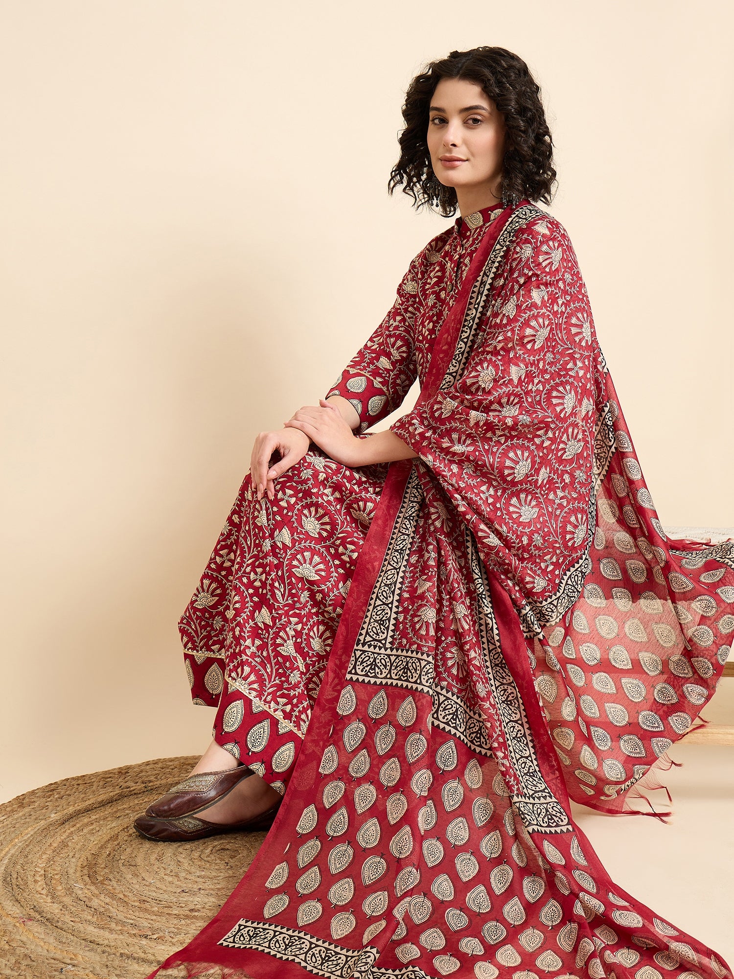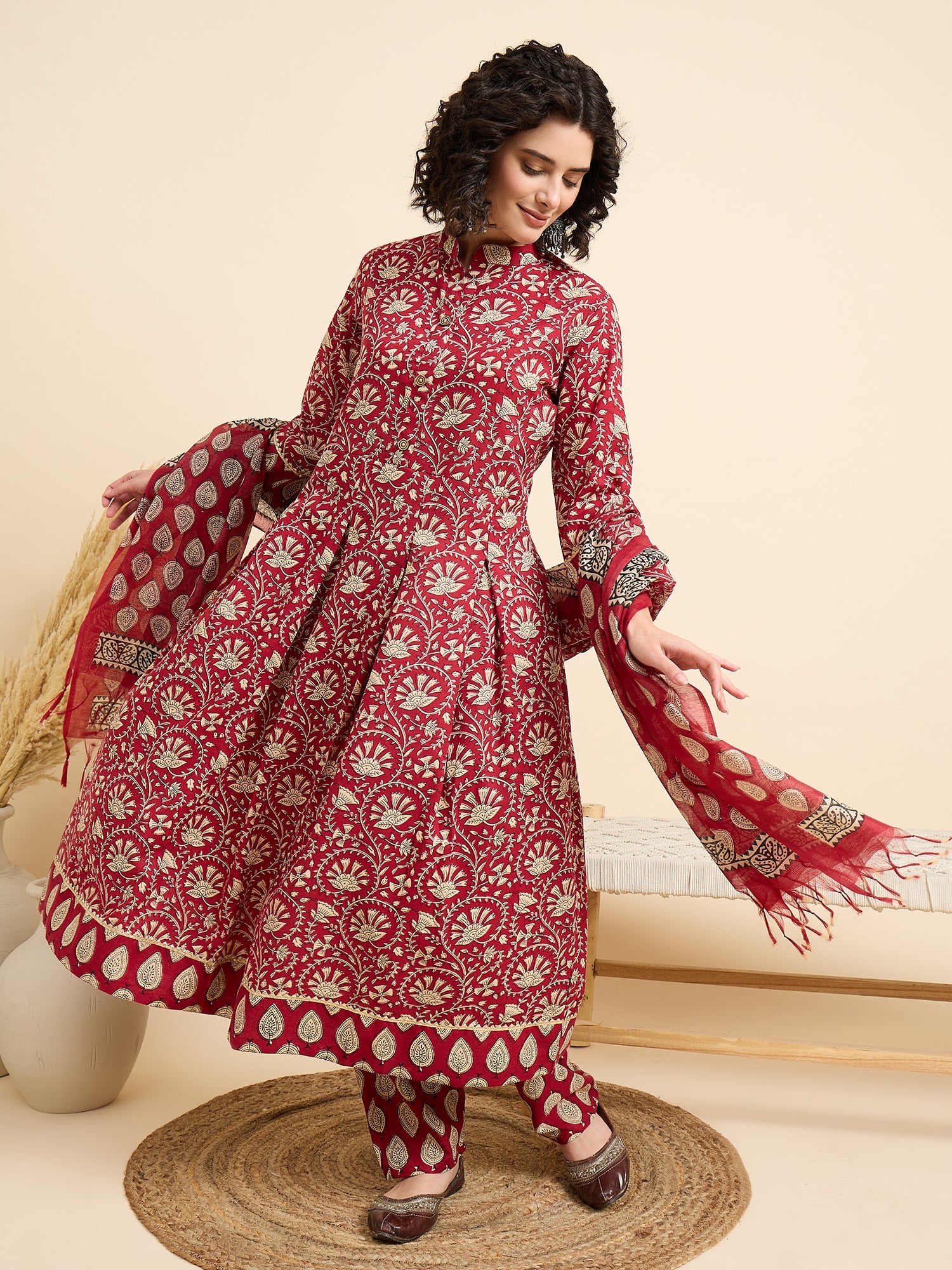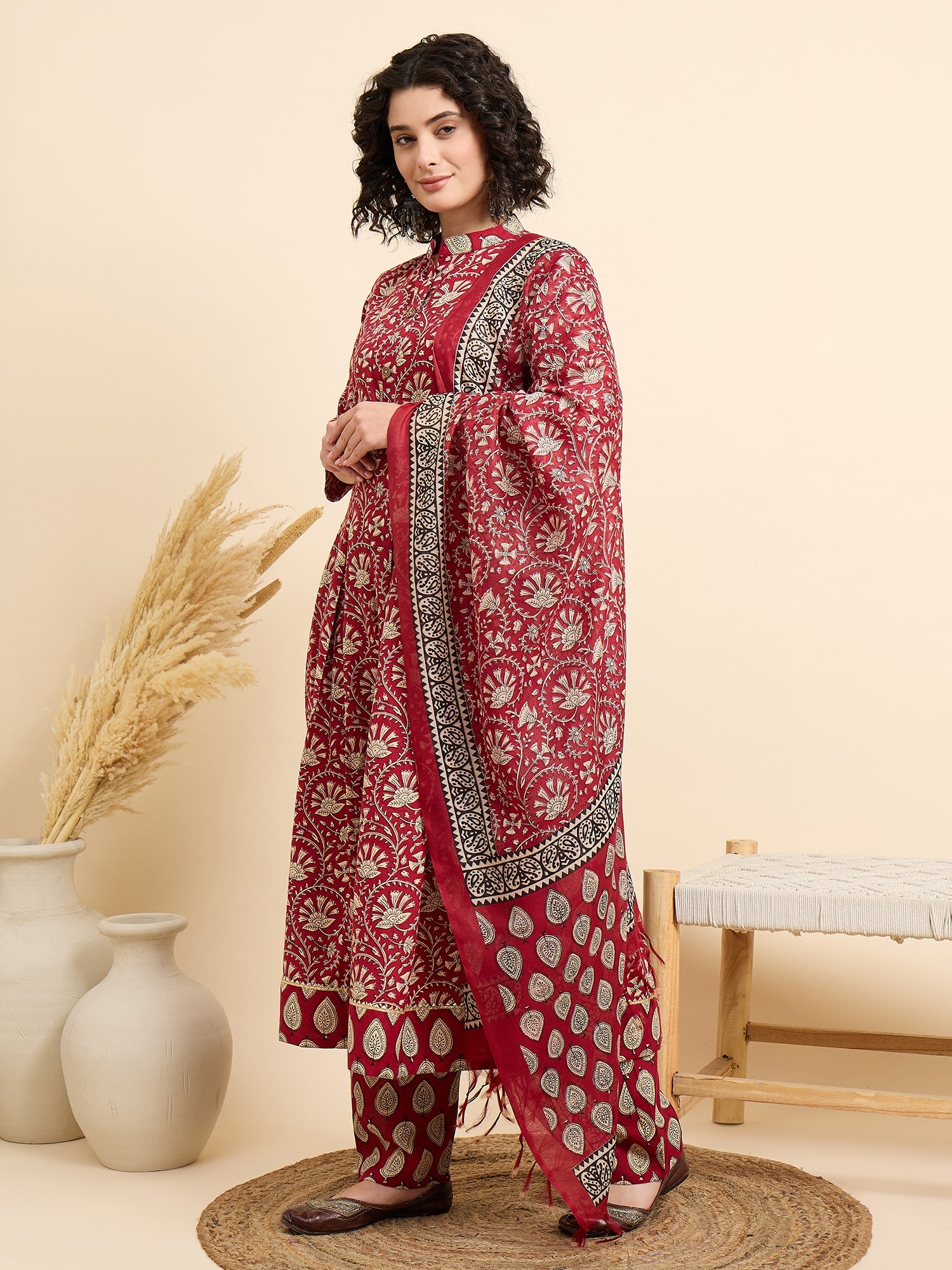 Ethnic Set Women Printed Anarkali Red Kurta And Pant Set With Dupatta