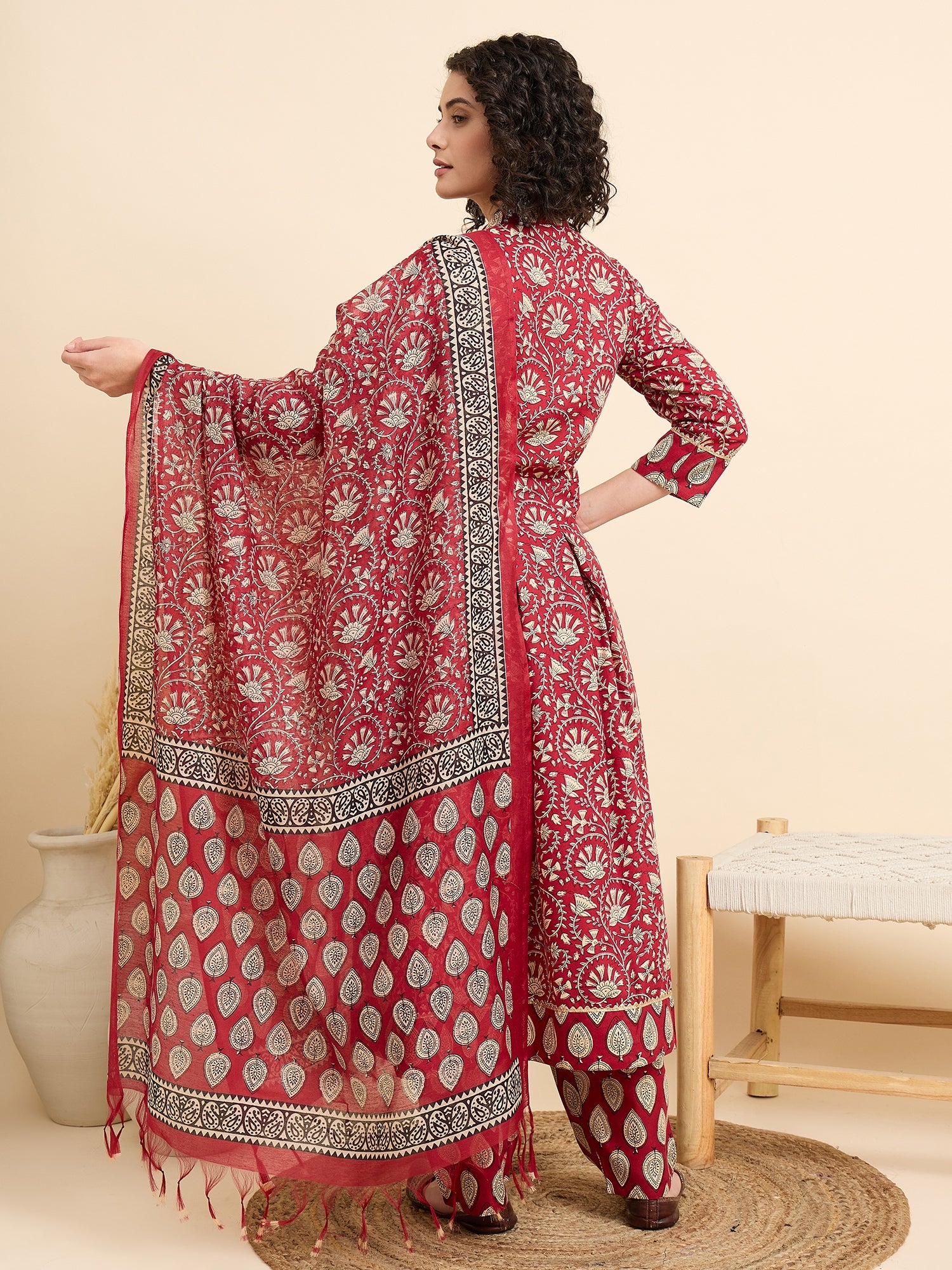 Ethnic Set Women Ajarakh Printed Kurta and Pant Set With Dupatta