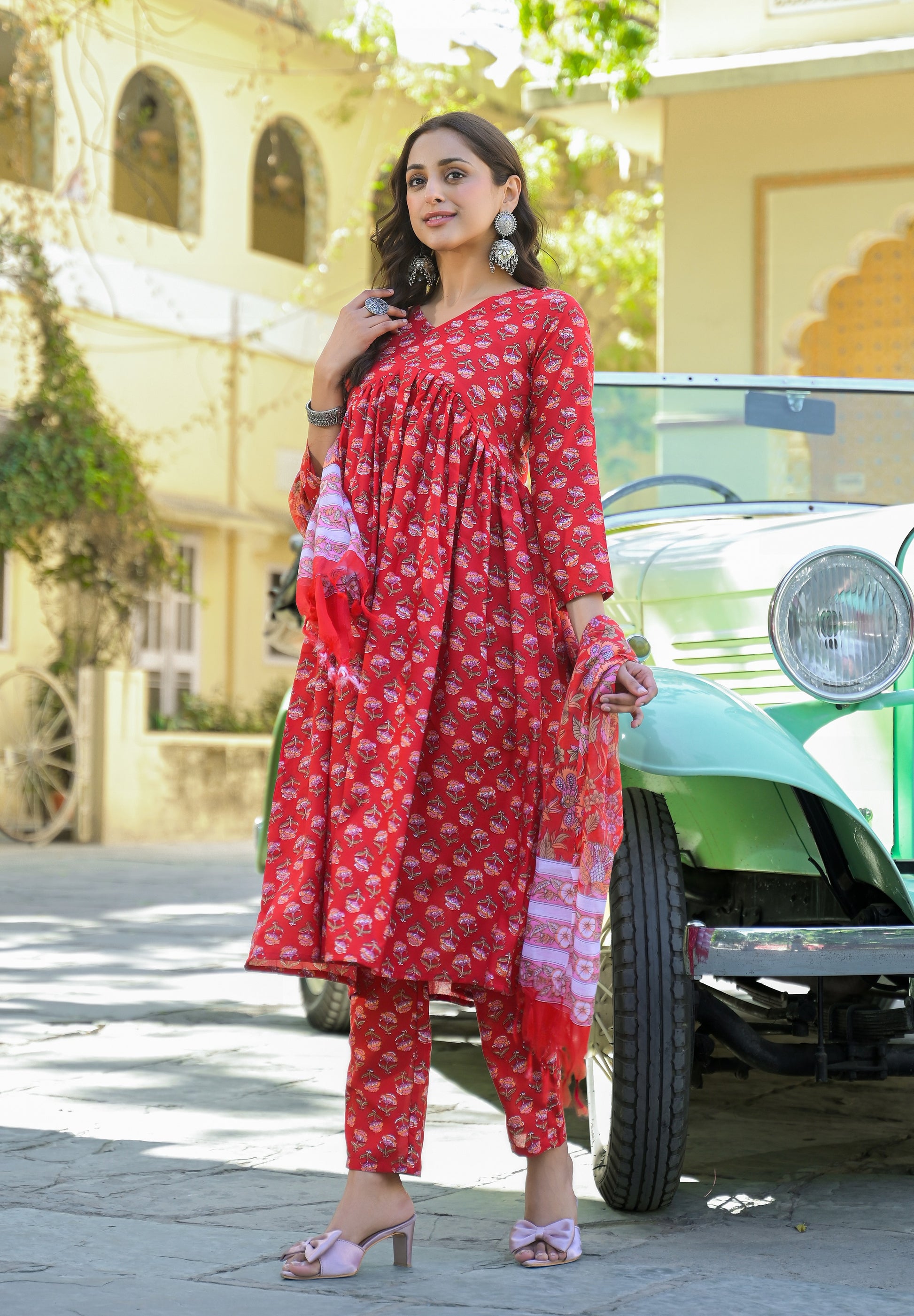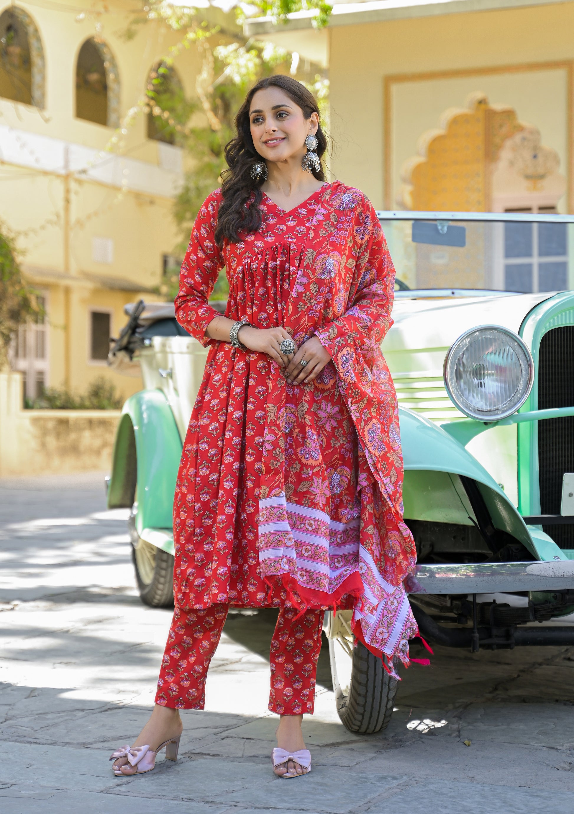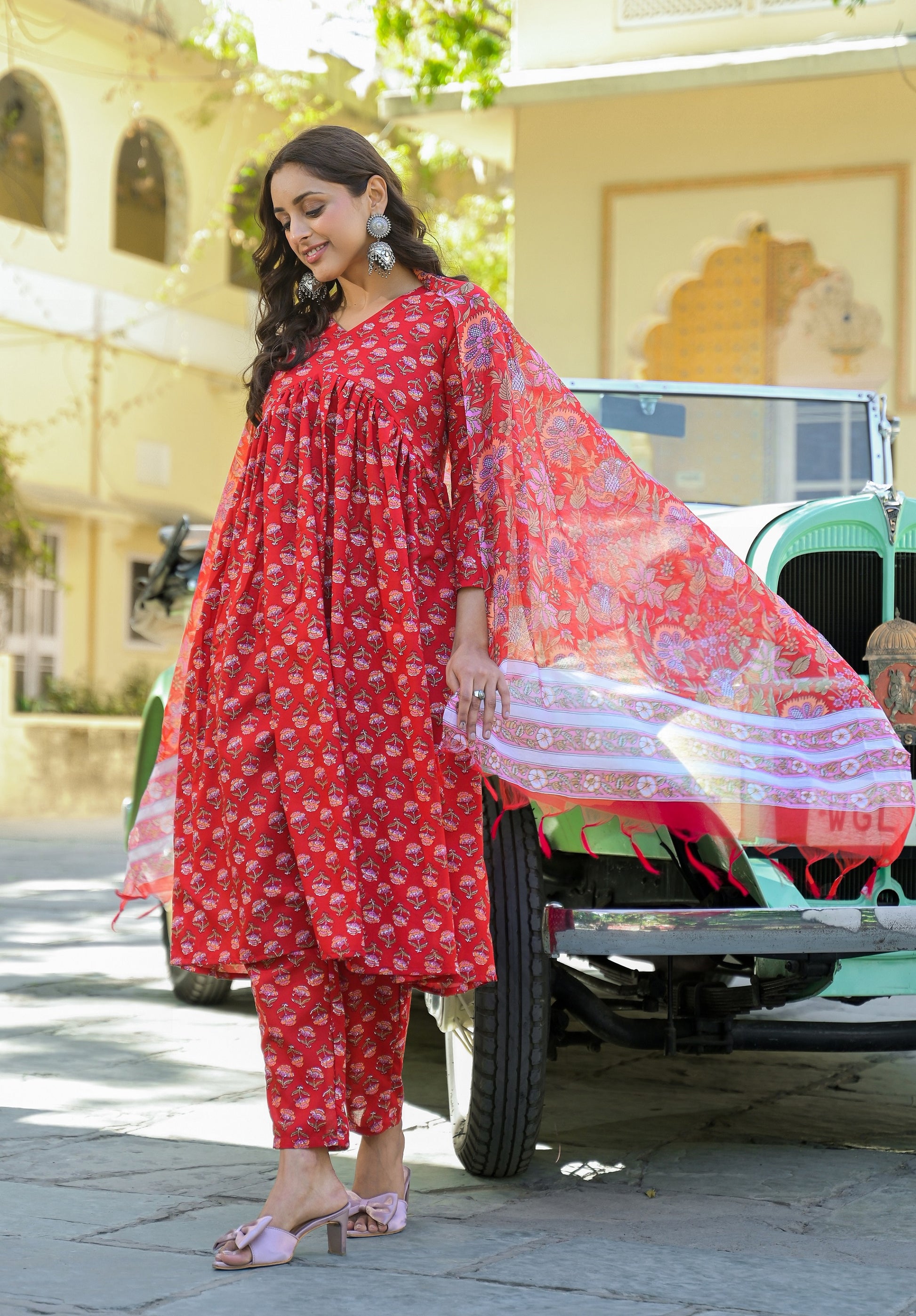 Ethnic Set Women Printed Anarkali Red Kurta And Pant Set With Dupatta