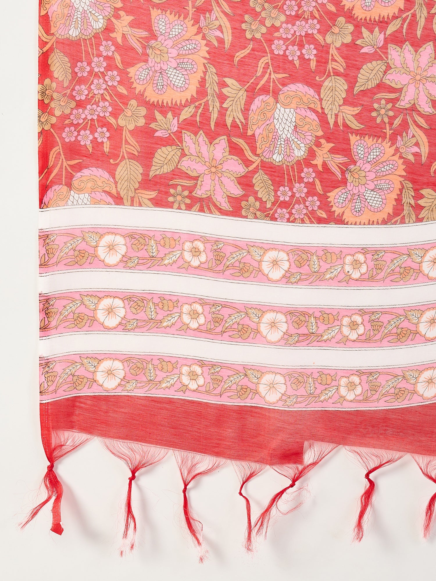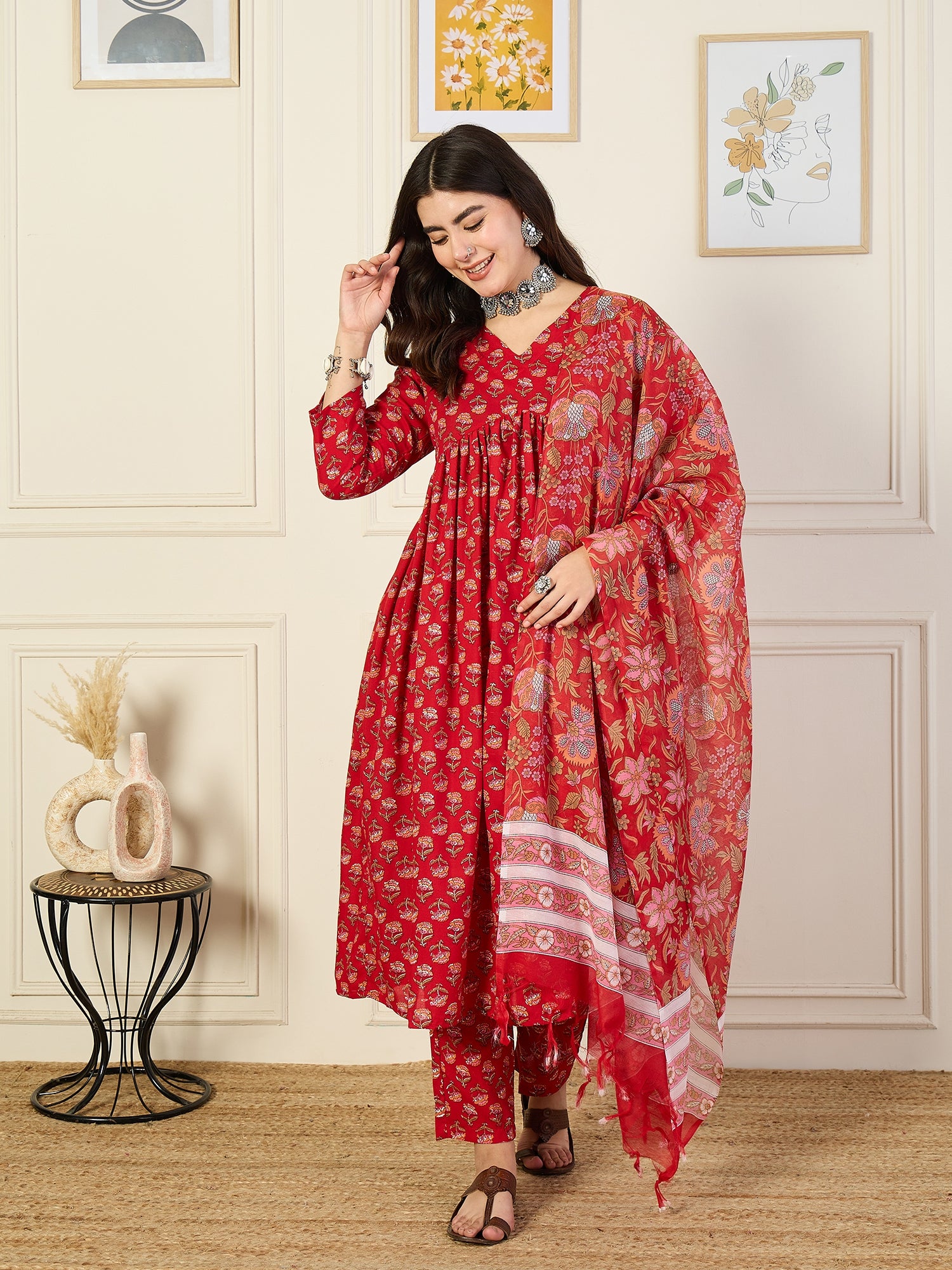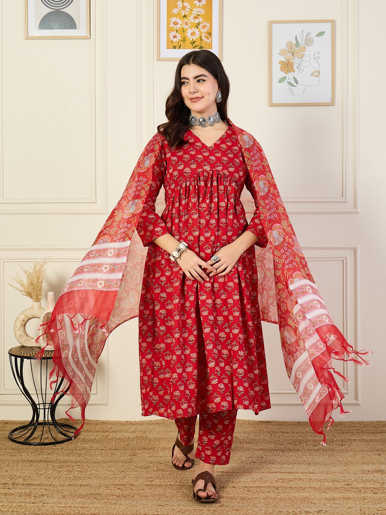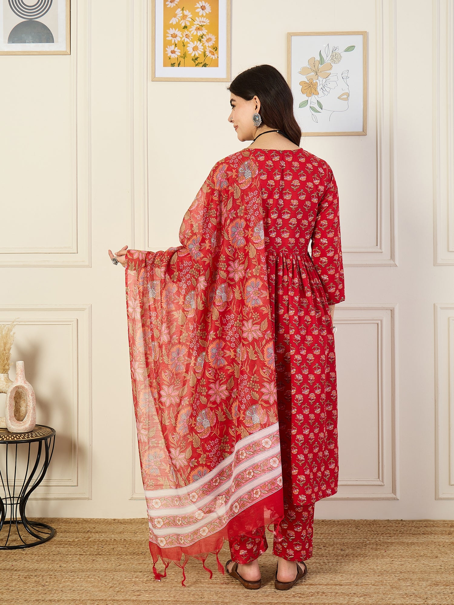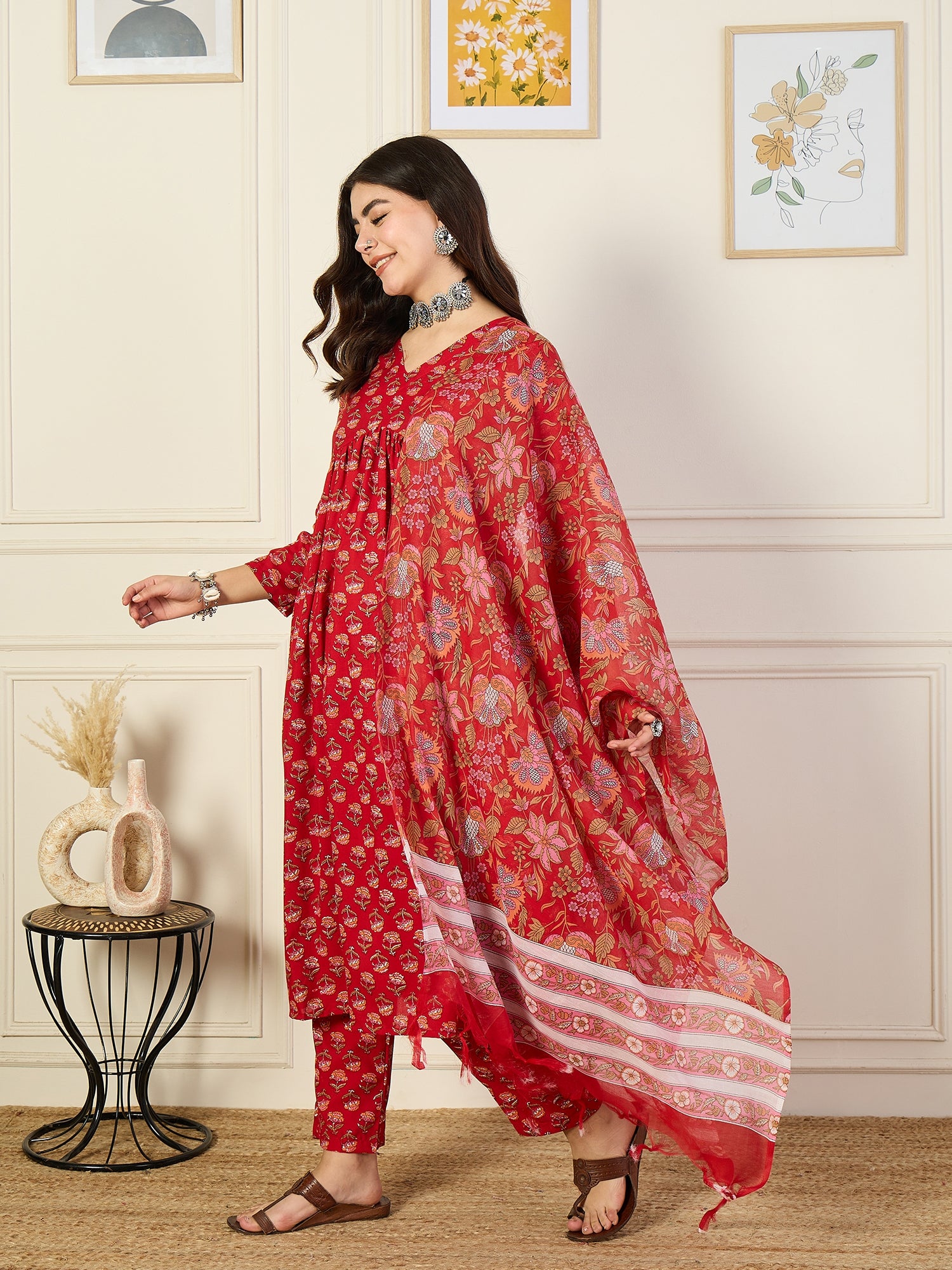 Ethnic Set Women Printed Anarkali Red Kurta and Pant Set With Dupatta