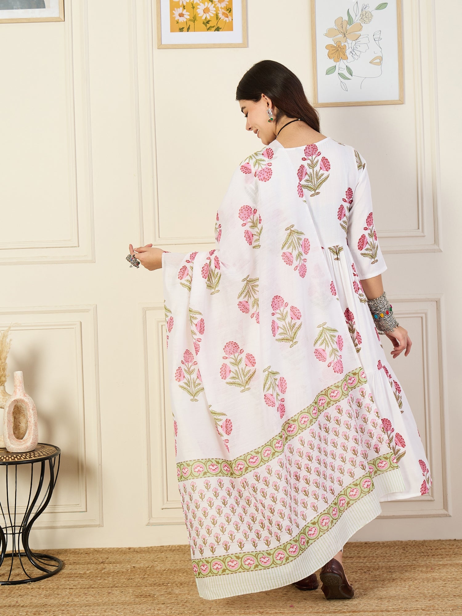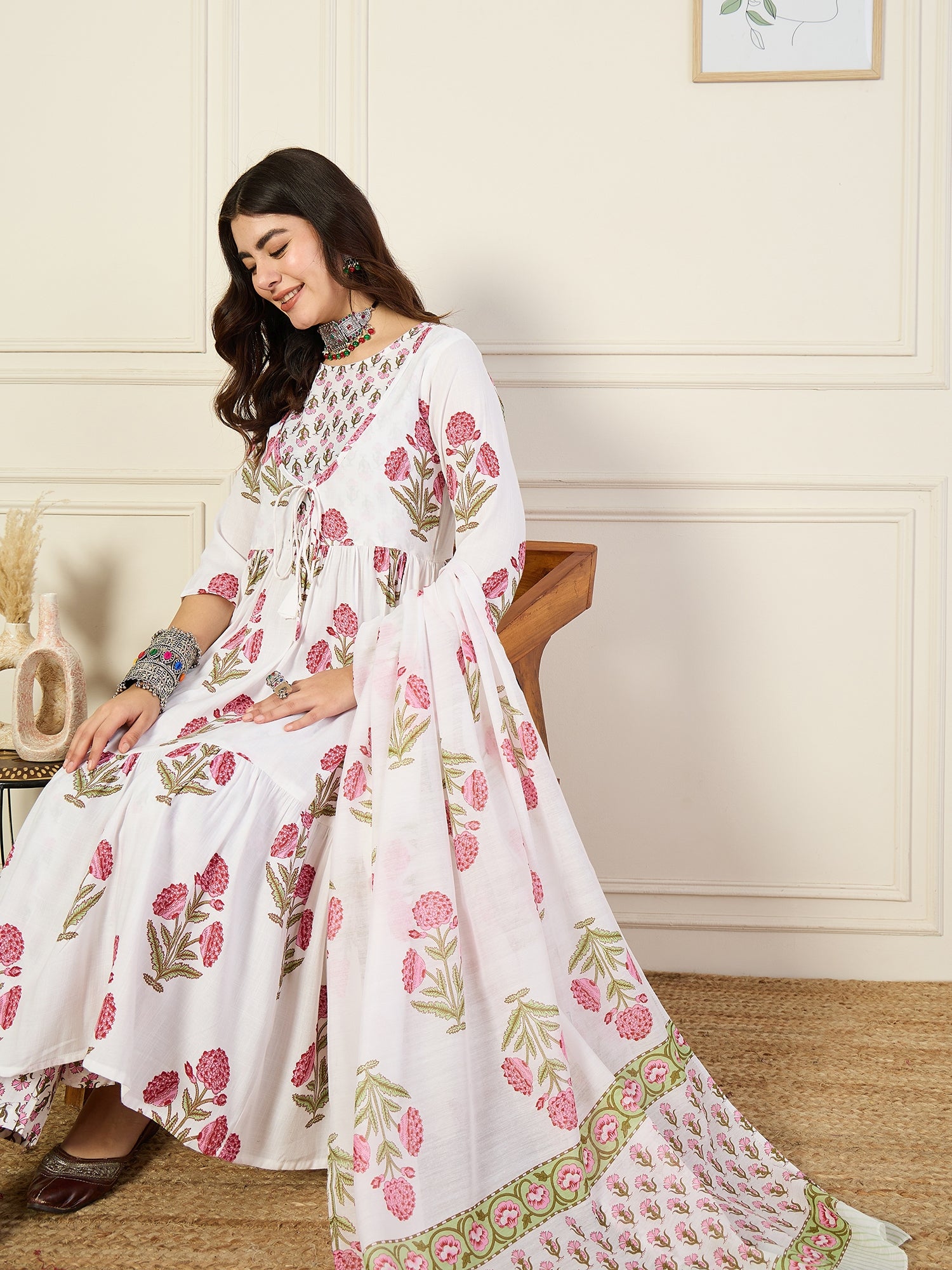 Ethnic Set Women Printed Anarkali White Kurta and Pant Set With Dupatta