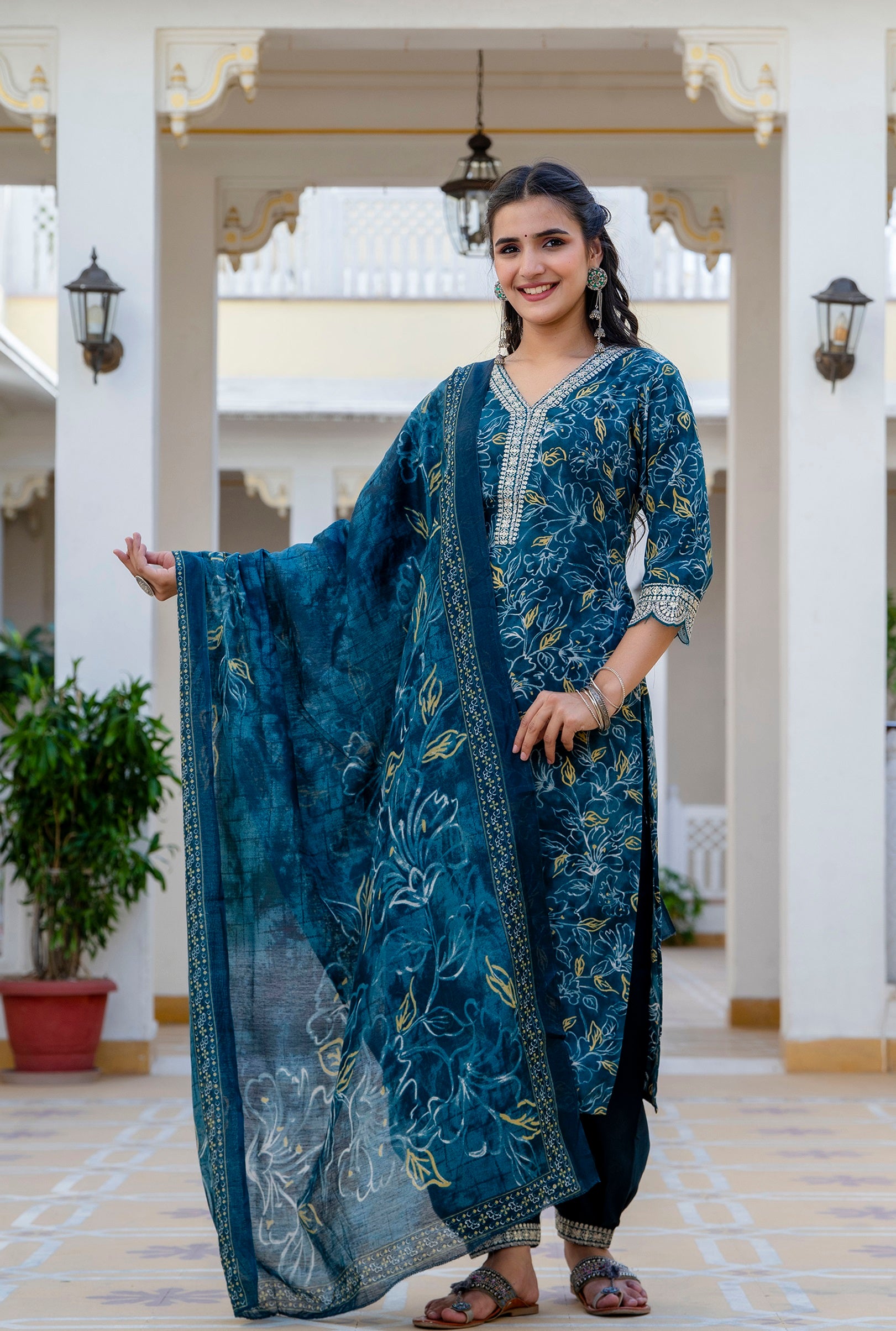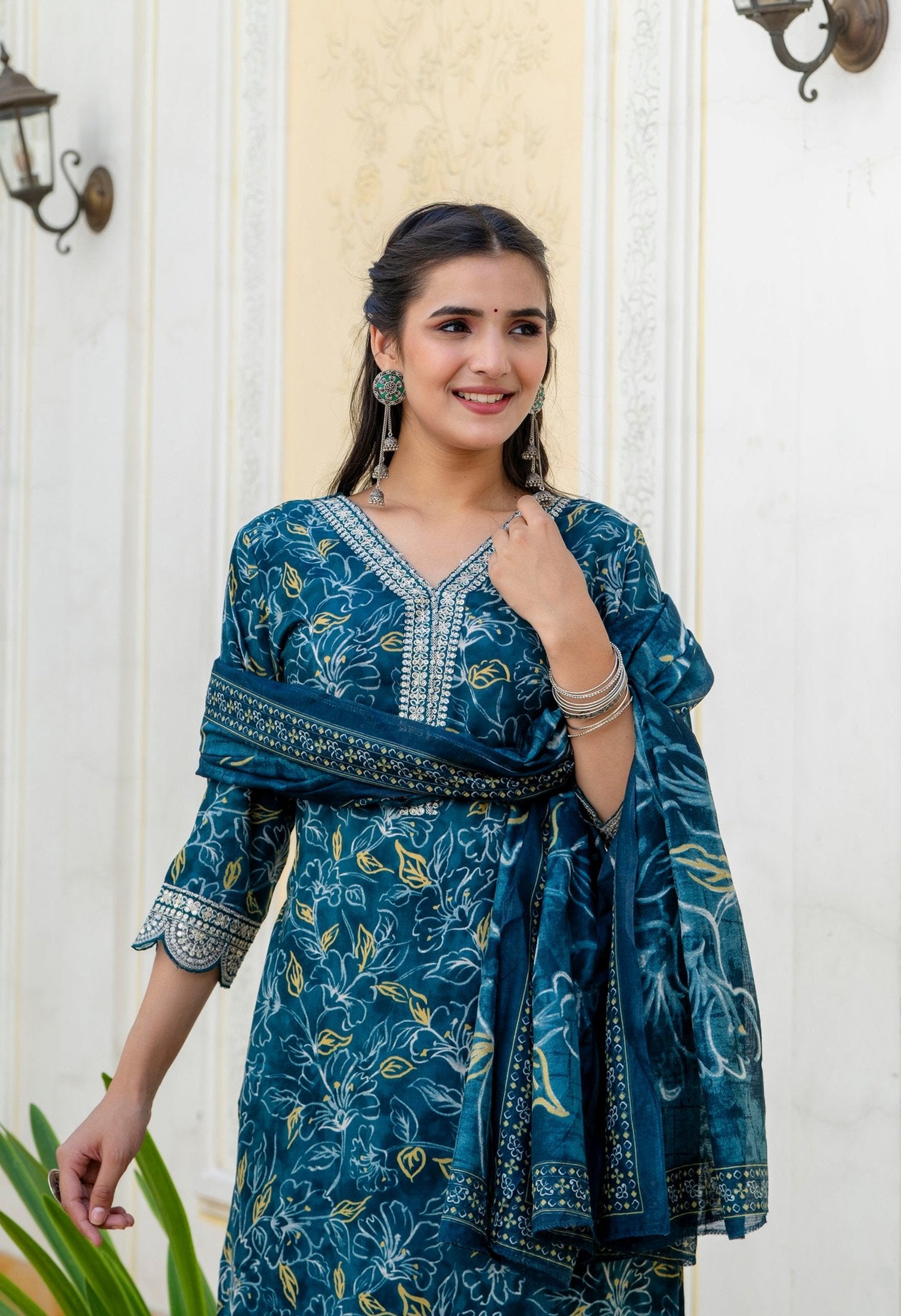 Ethnic Set Women Floral PrintedStraight Kurta and Pant set with Dupatta