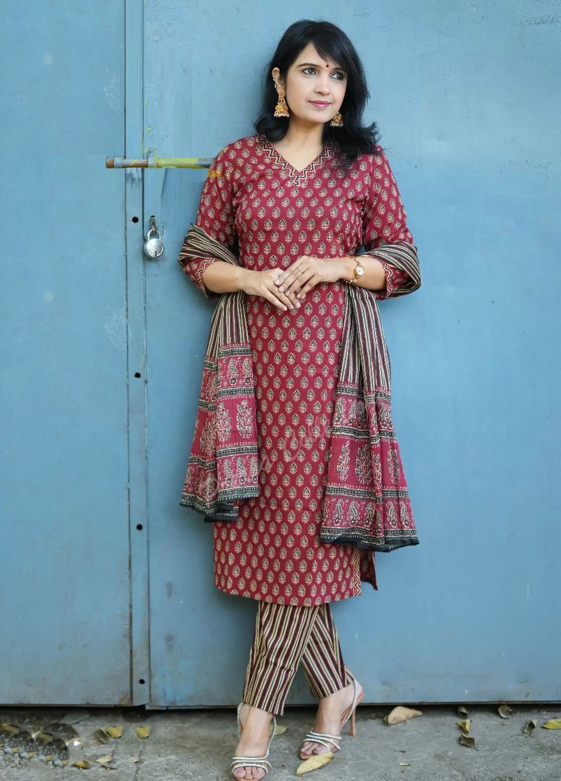 Ethnic Set Women Ajarakh Printed Kurta and Pant Set With Dupatta