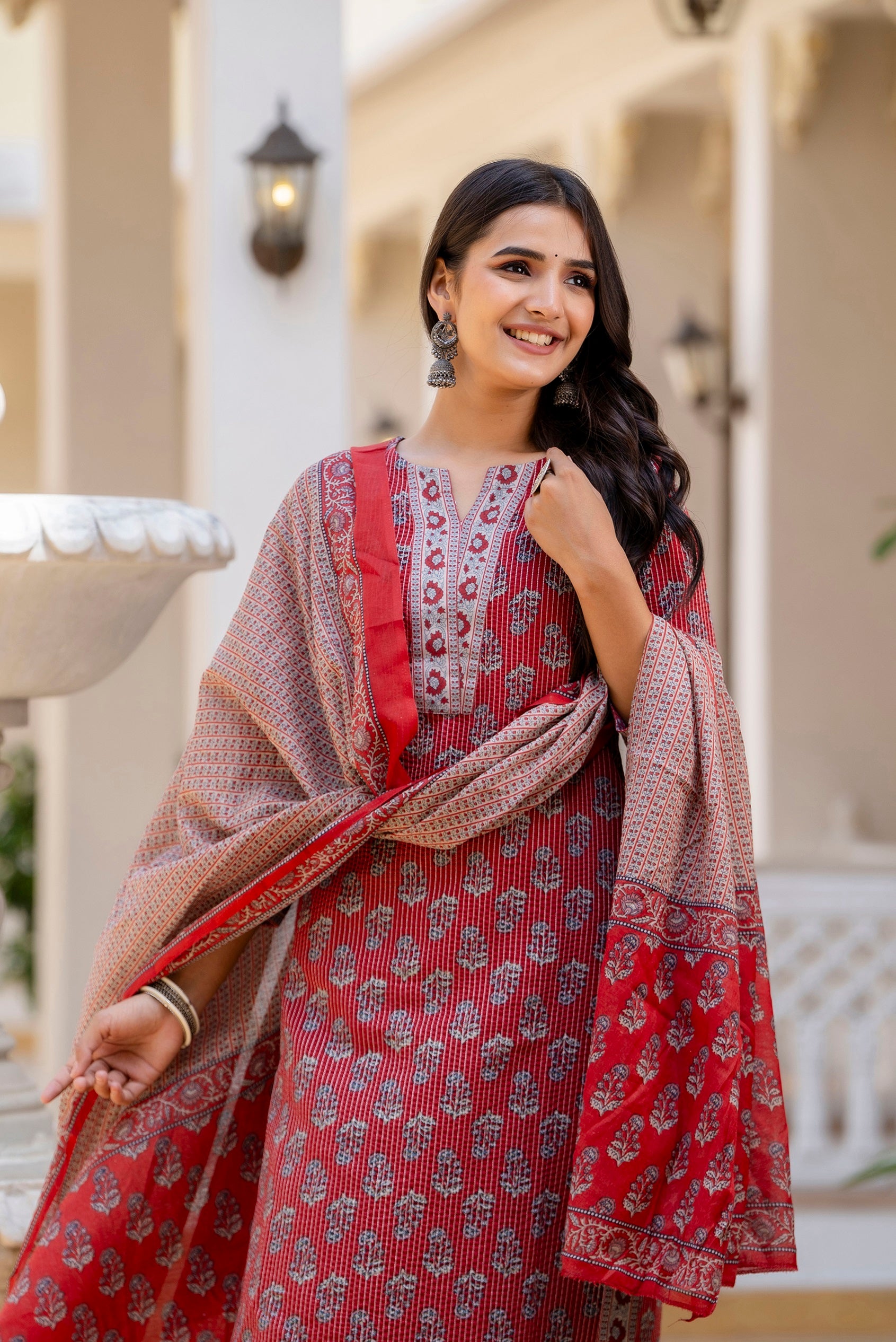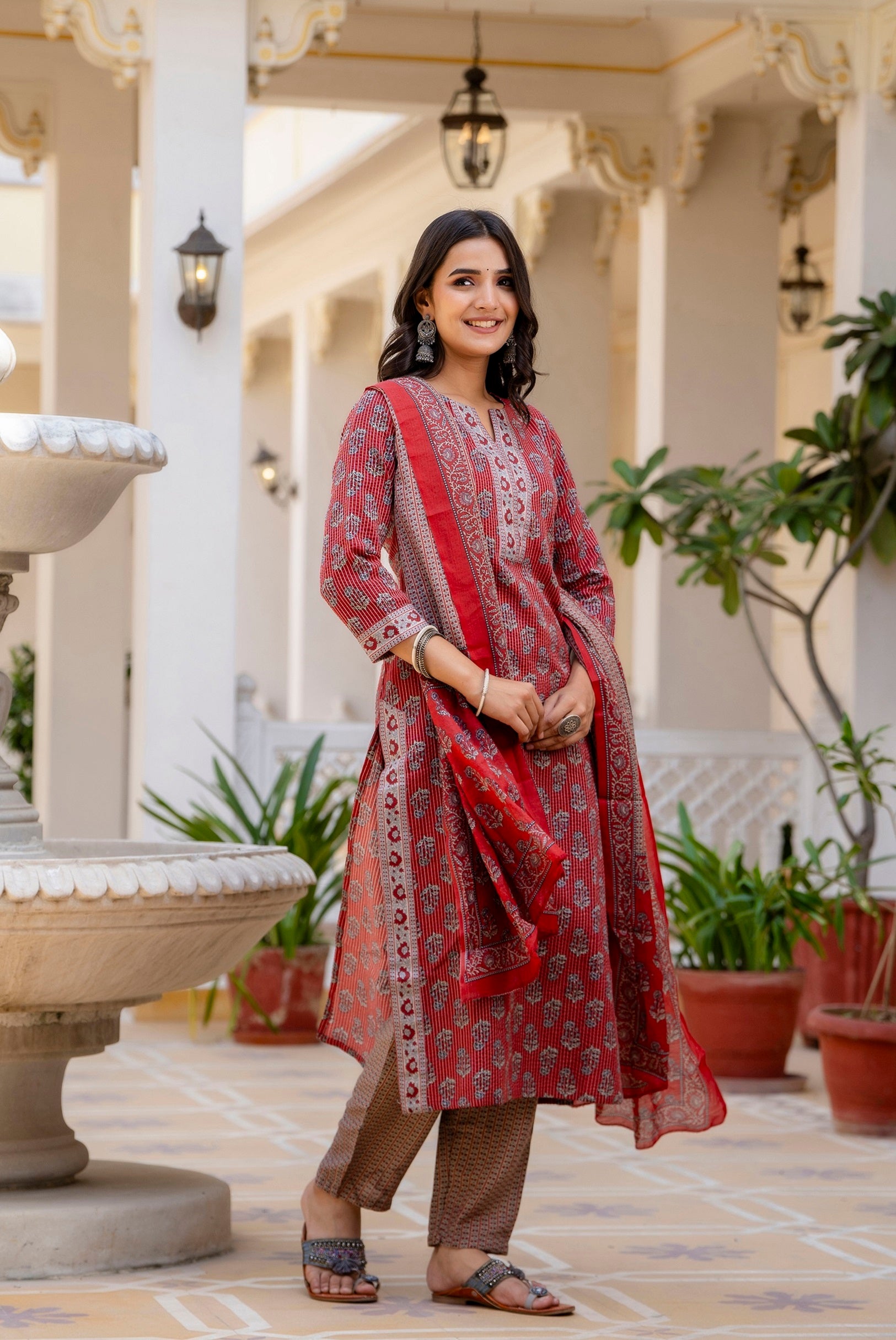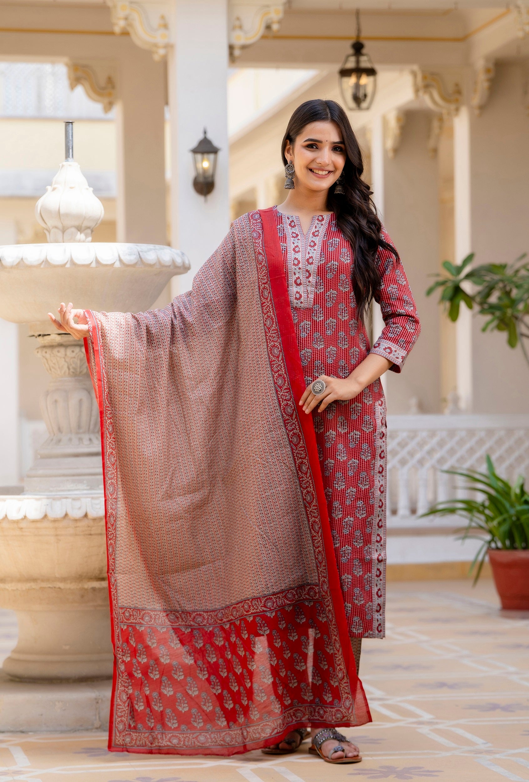 Ethnic Set Women Printed Straight Red Kurta and Pant set with Dupatta