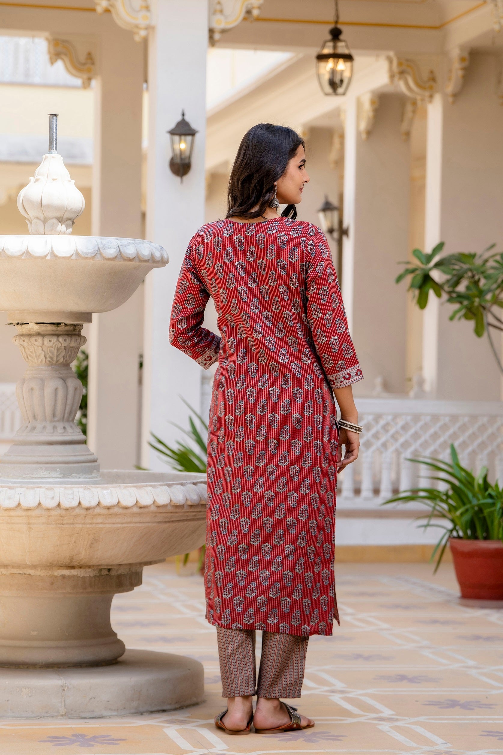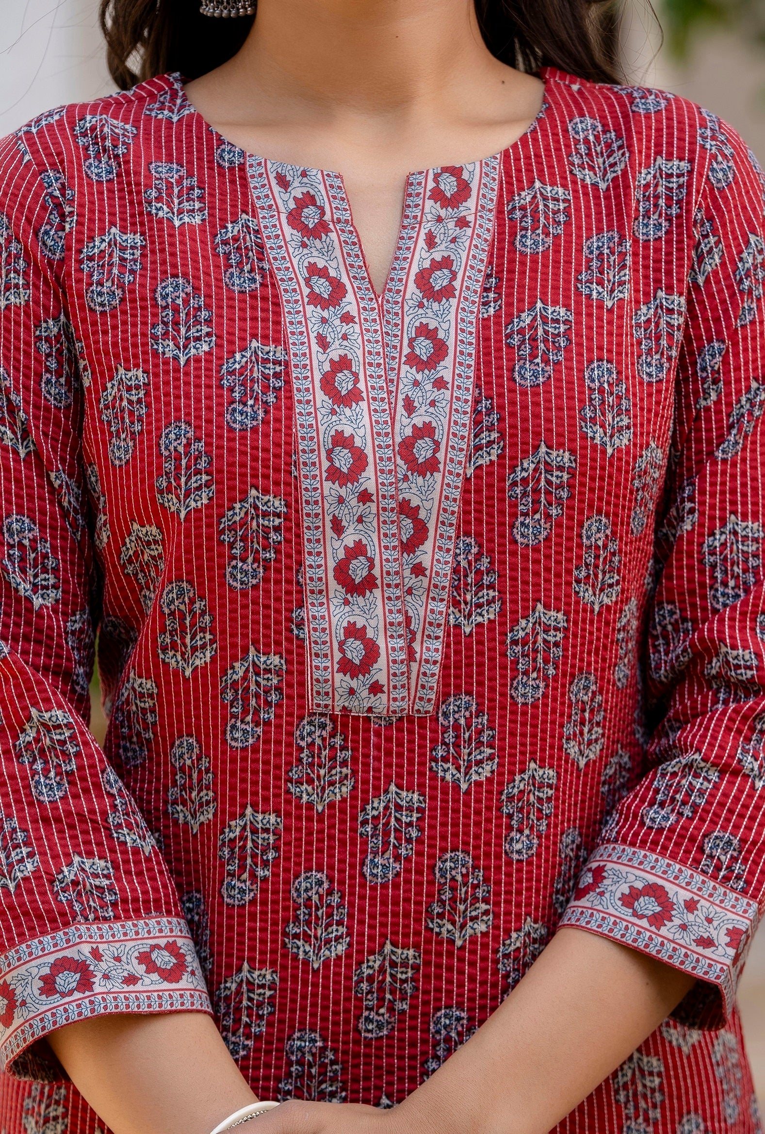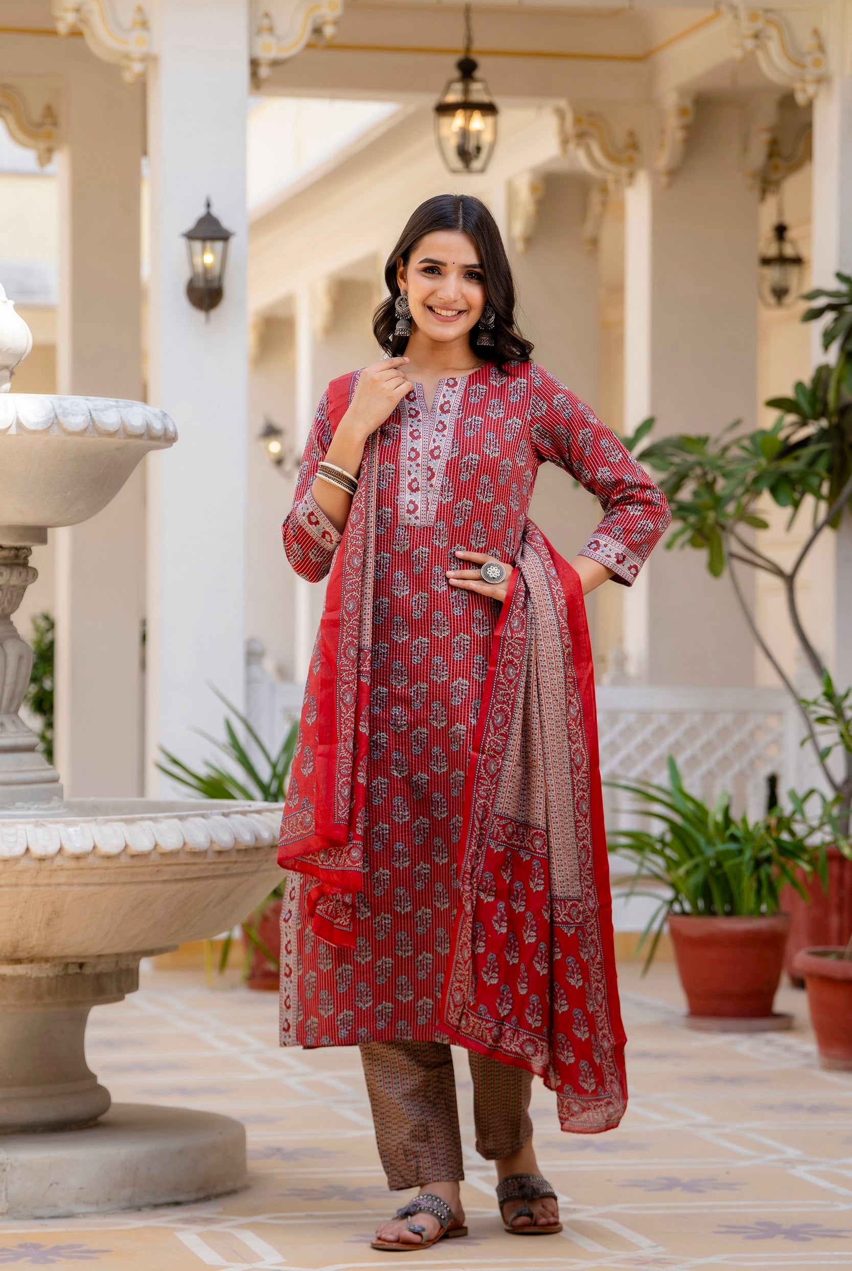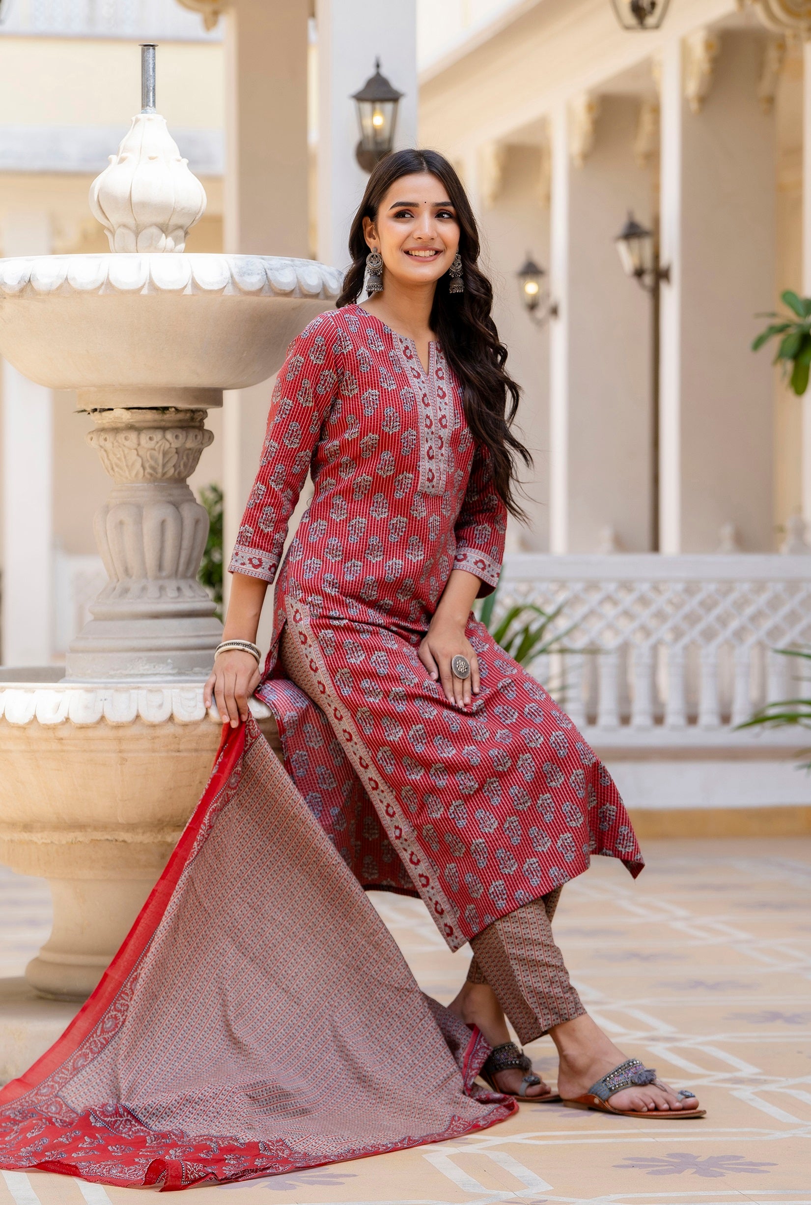 Ethnic Set Women Printed Straight Red Kurta and Pant set with Dupatta