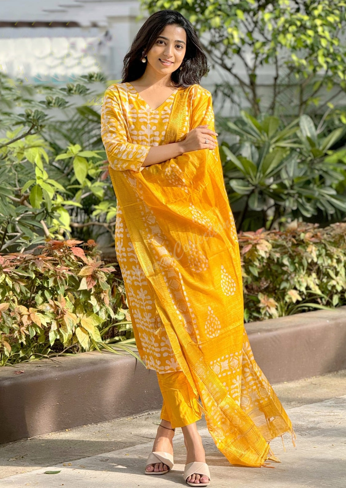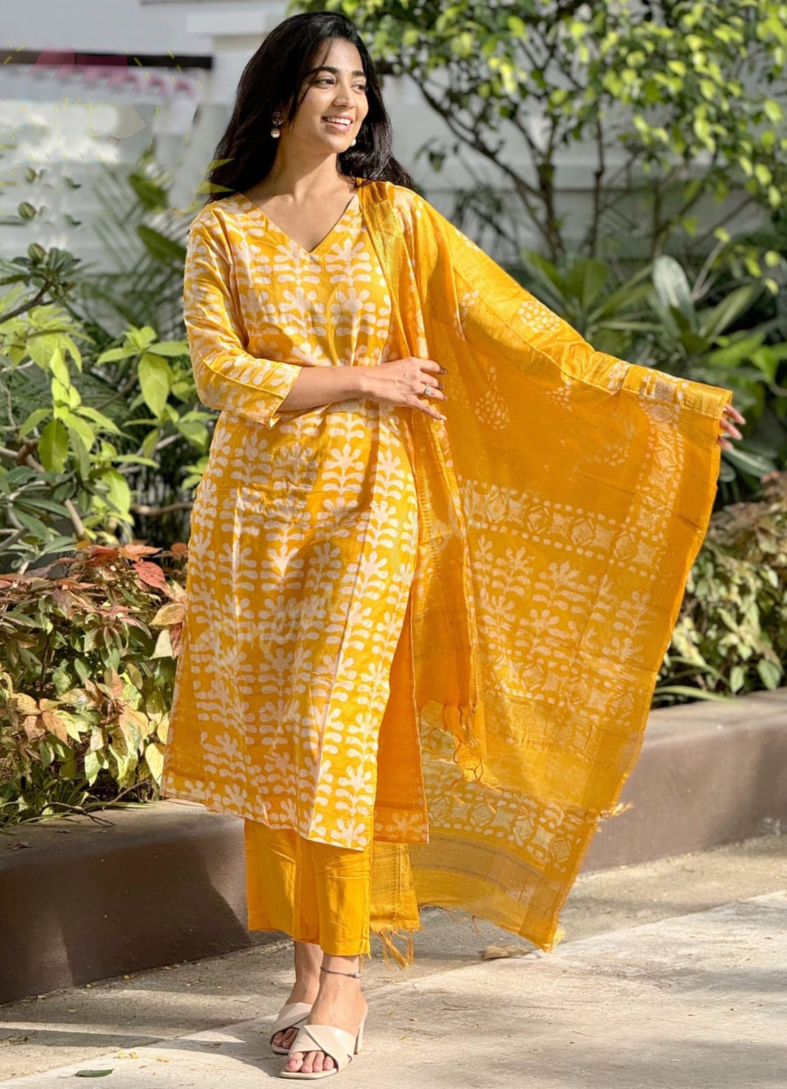 Ethnic Set Women Printed Straight Yellow Kurta and Pant Set With Dupatta