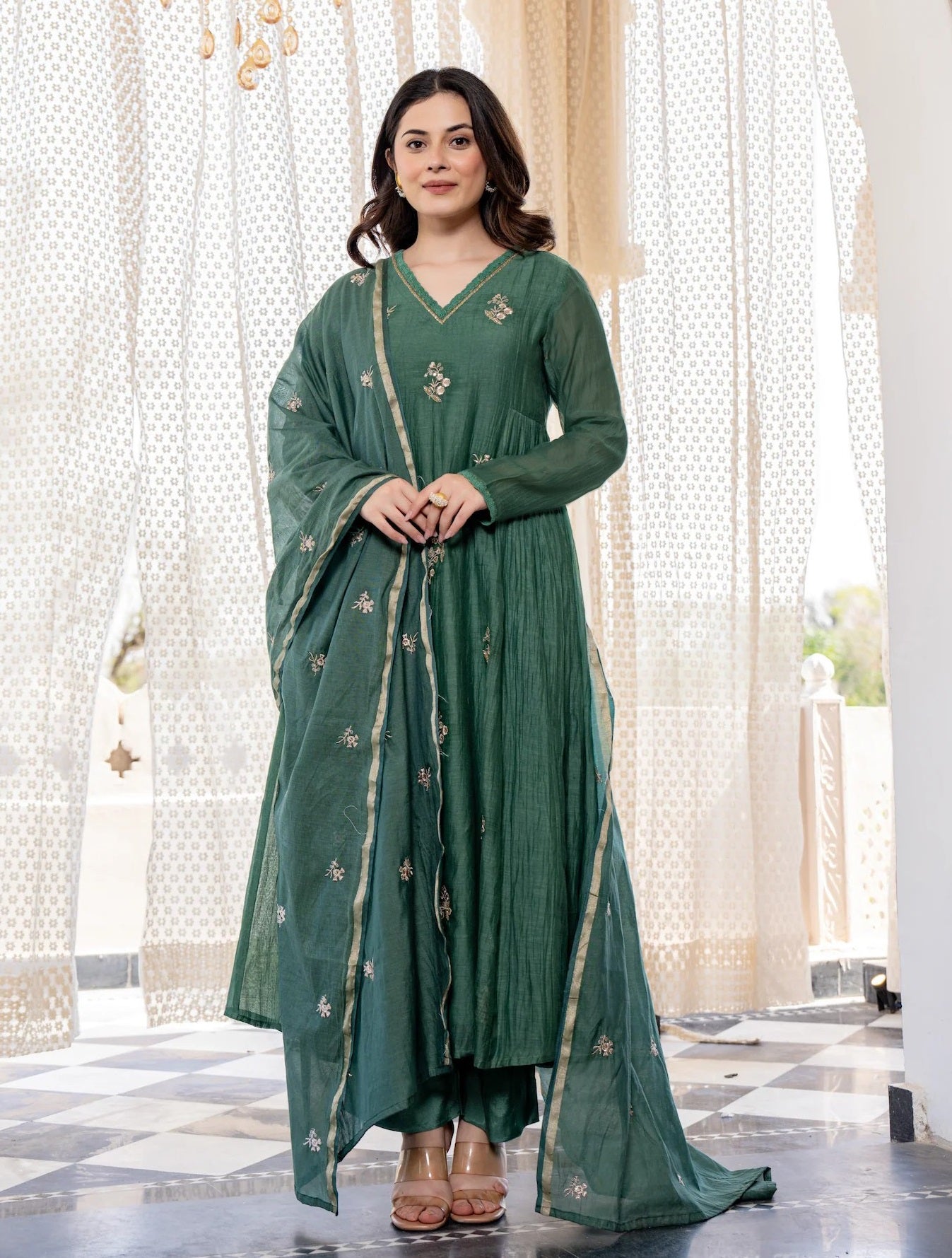 Women's Solid Embroidery Kurta Set – Ethnic Festive Wear (Kurta + Pants + Dupatta)