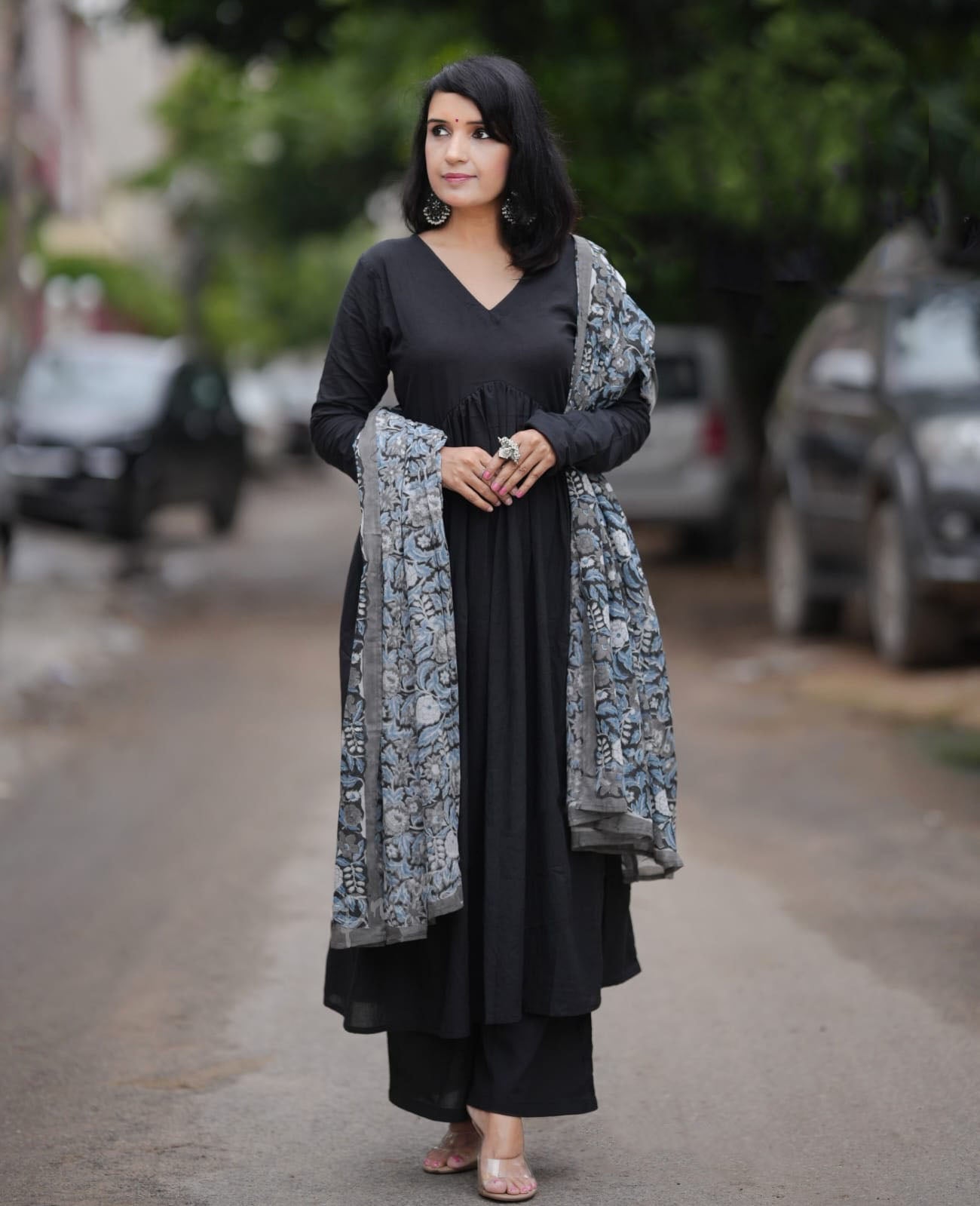 Ethnic Set Women Solid A-Line BLack Kurta And Pant Set With Dupatta