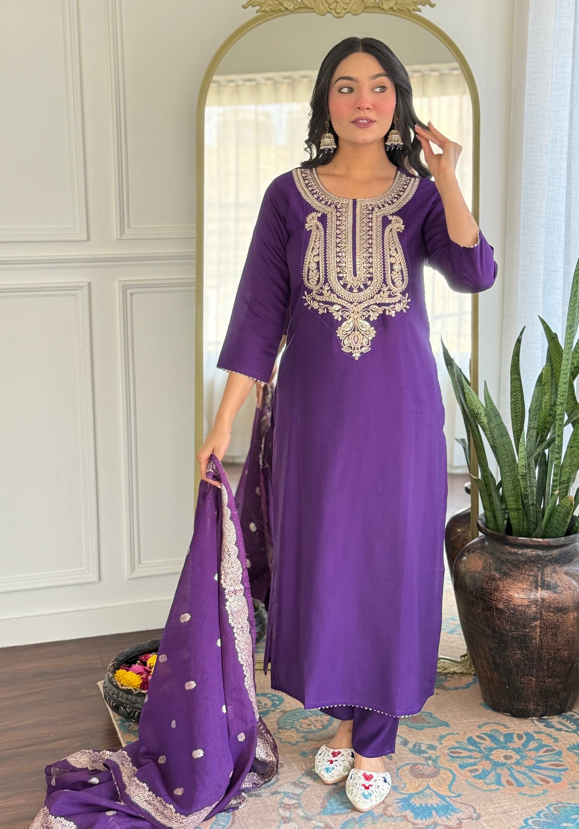 Women's Solid Embroidery Kurta Set – Ethnic Festive Wear (Kurta + Pants + Dupatta)
